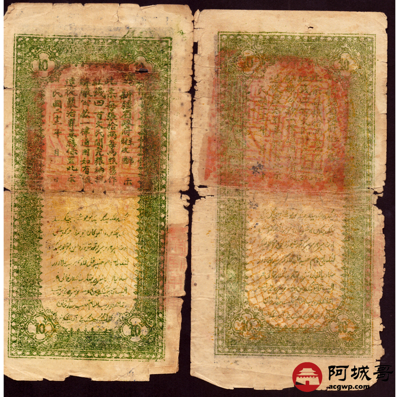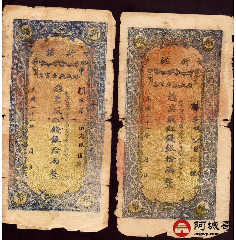 Lot:31 民国二十二年 新疆财政厅库官票 红钱银拾两整 2张 65至67成新