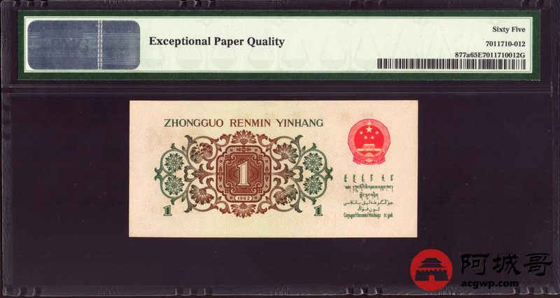 Lot:14 三版 1962年 三版珍品背绿壹角 PMG 65EPQ 好号无4