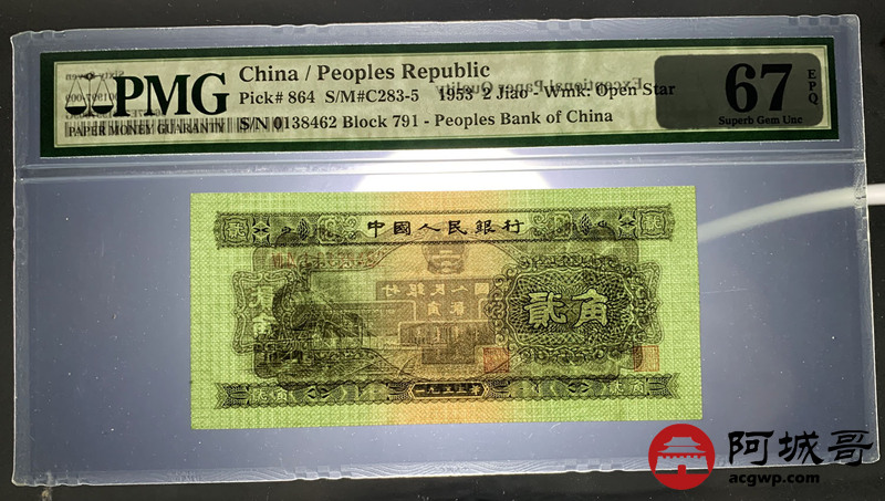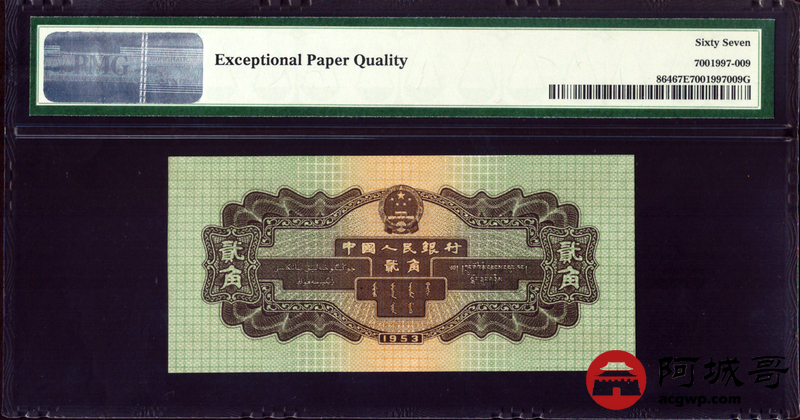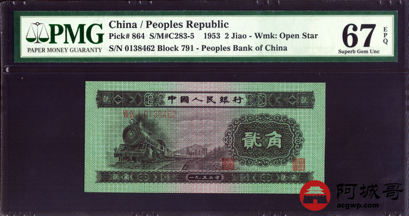 Lot:12 二版 1953年 中国人民银行 火车头贰角 PMG 67EPQ