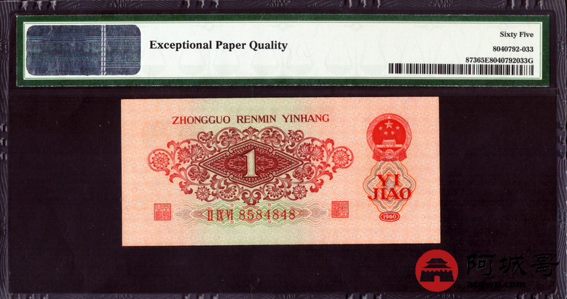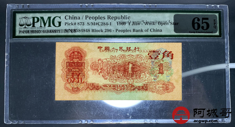Lot:10 三版 1960年 中国人民银行 珍品枣红壹角 PMG 65EPQ