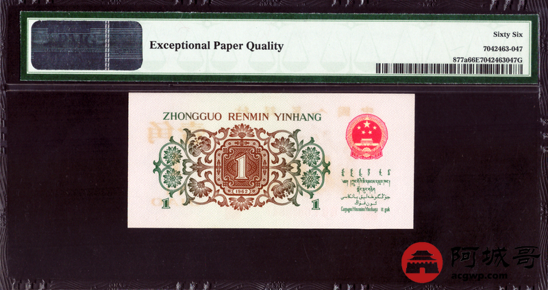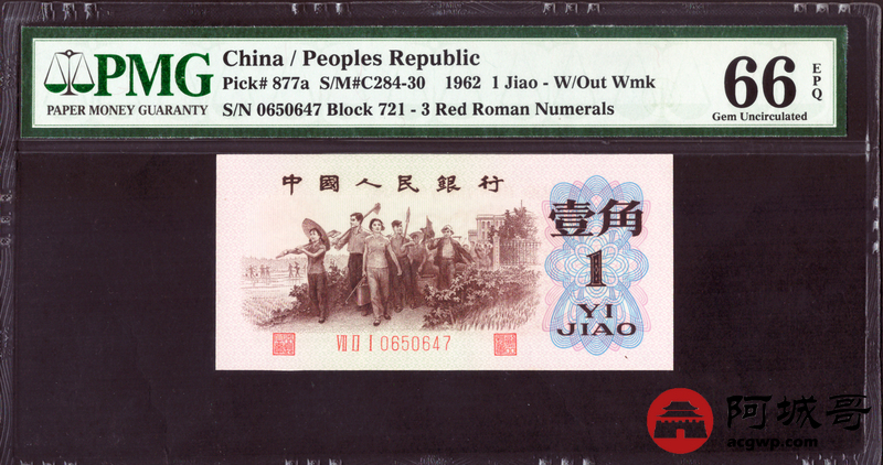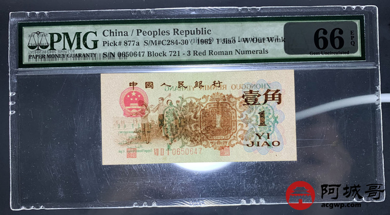 Lot:17 三版 1962年 中国人民银行壹角 三版小珍品背绿 PMG 66EPQ