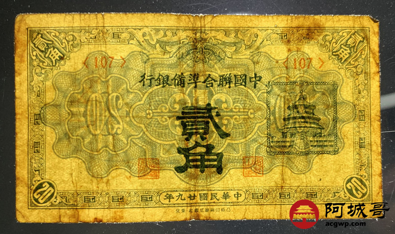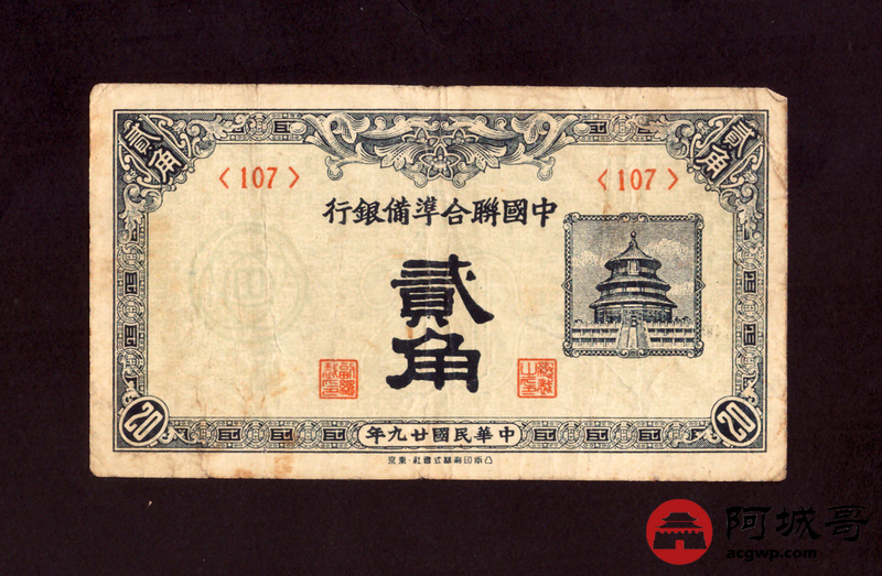 Lot:50 民国29年 中国联合准备银行 贰角 69成新