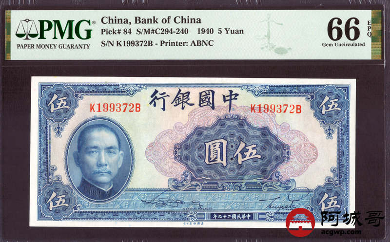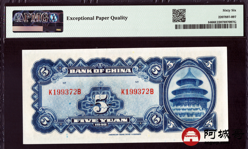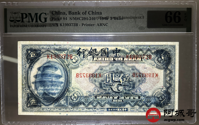 Lot:15 民国29年 中国银行 伍圆 PMG 66EPQ 好号无4、生日号