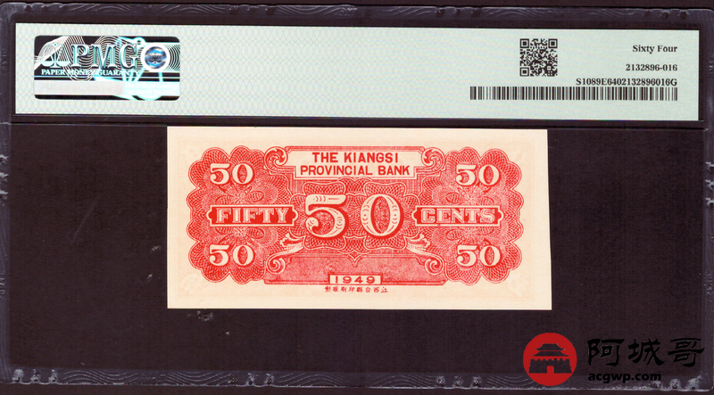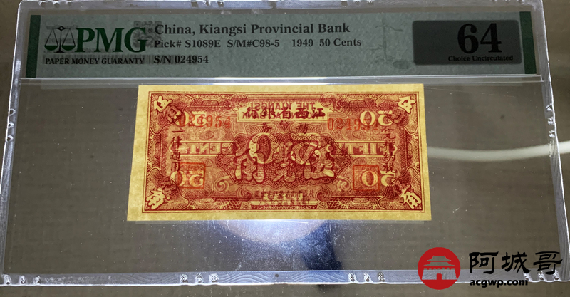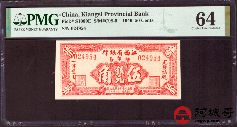 Lot:62 民国38年 江西省银行 伍角 PMG 64