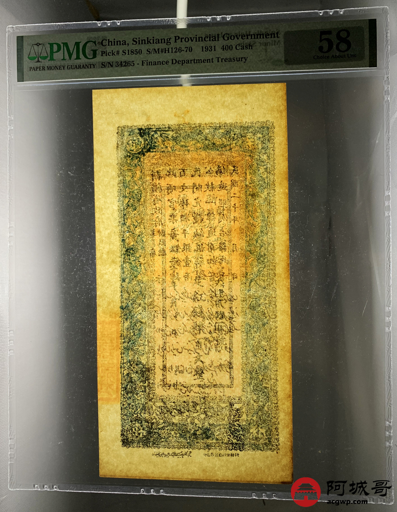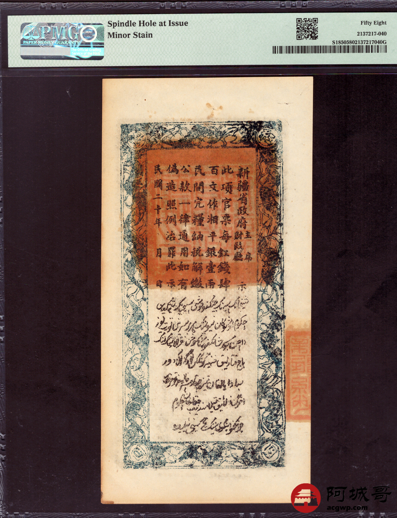 Lot:5 民国二十年 新疆财政厅库官票 红钱肆佰文整 PMG 58