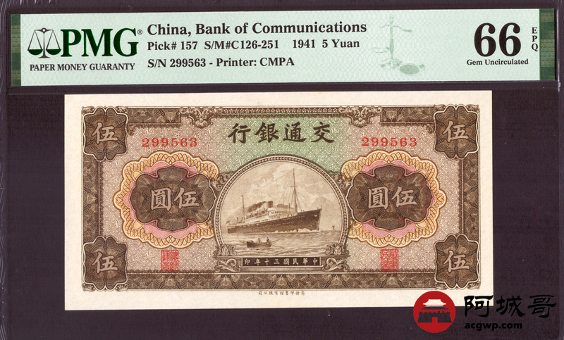 Lot:38 民国30年 交通银行 伍圆 PMG 66EPQ 好号无47