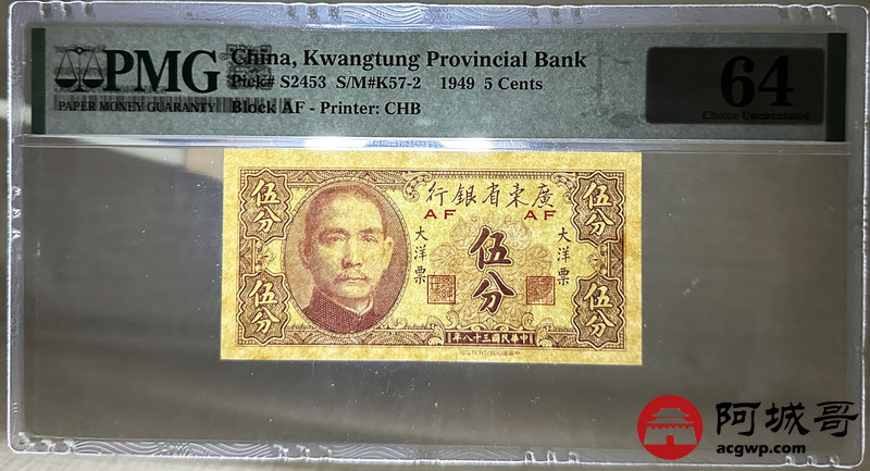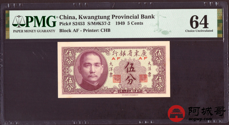 Lot:57 民国38年 广东省银行 伍分 PMG 64