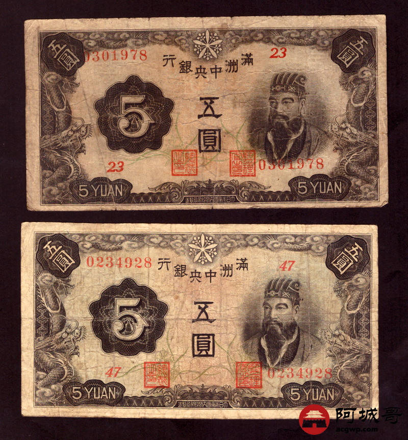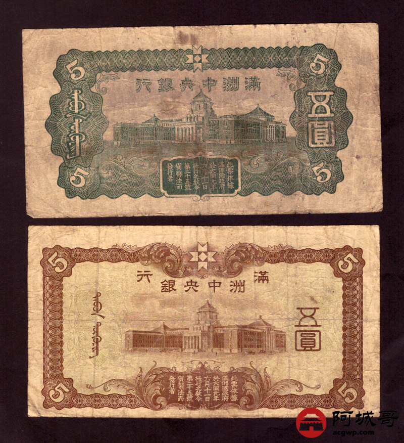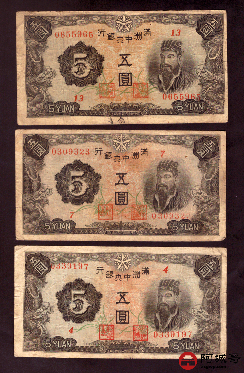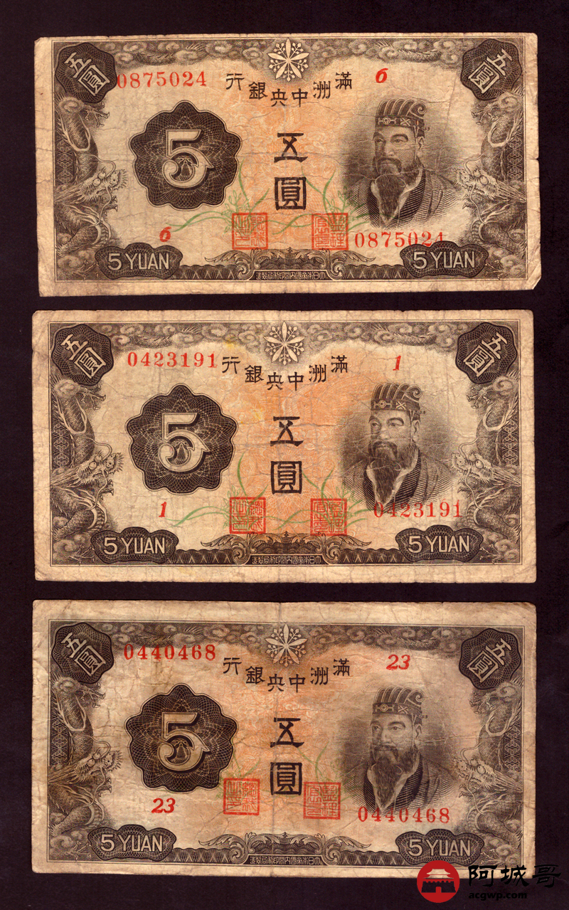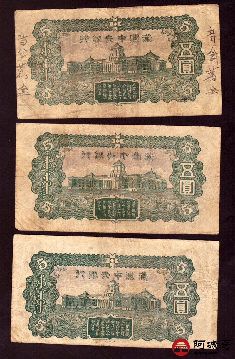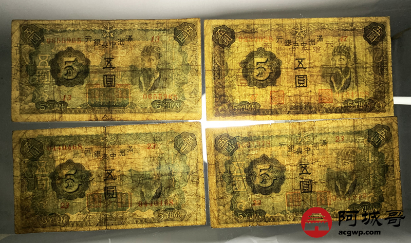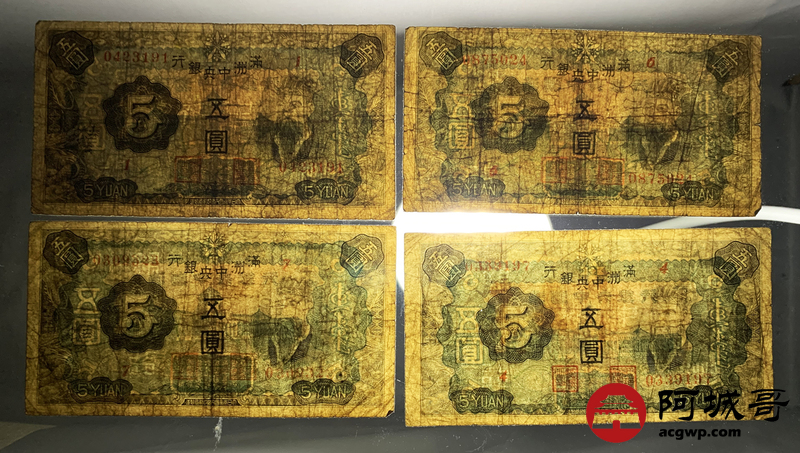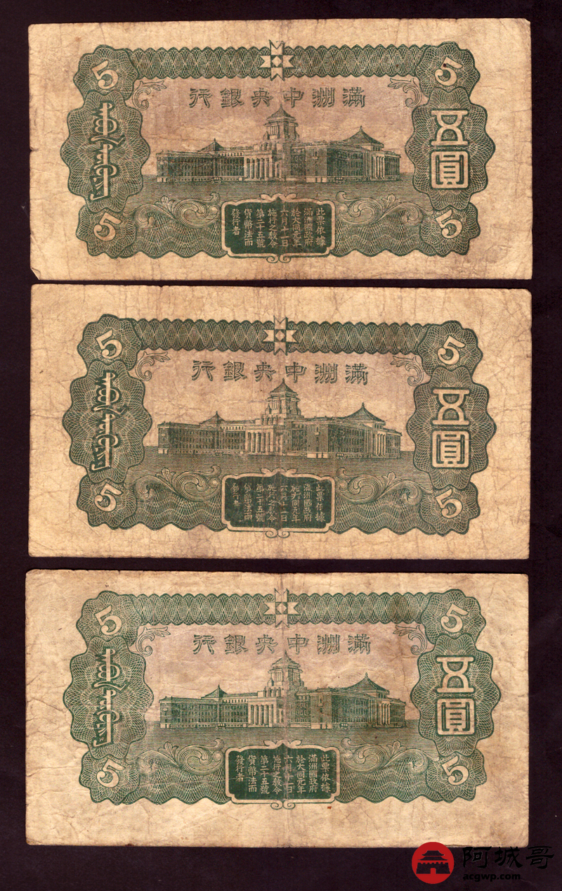 Lot:43 满洲中央银行 伍圆 8张 69至7成新
