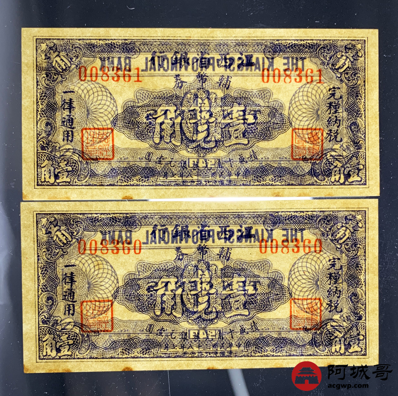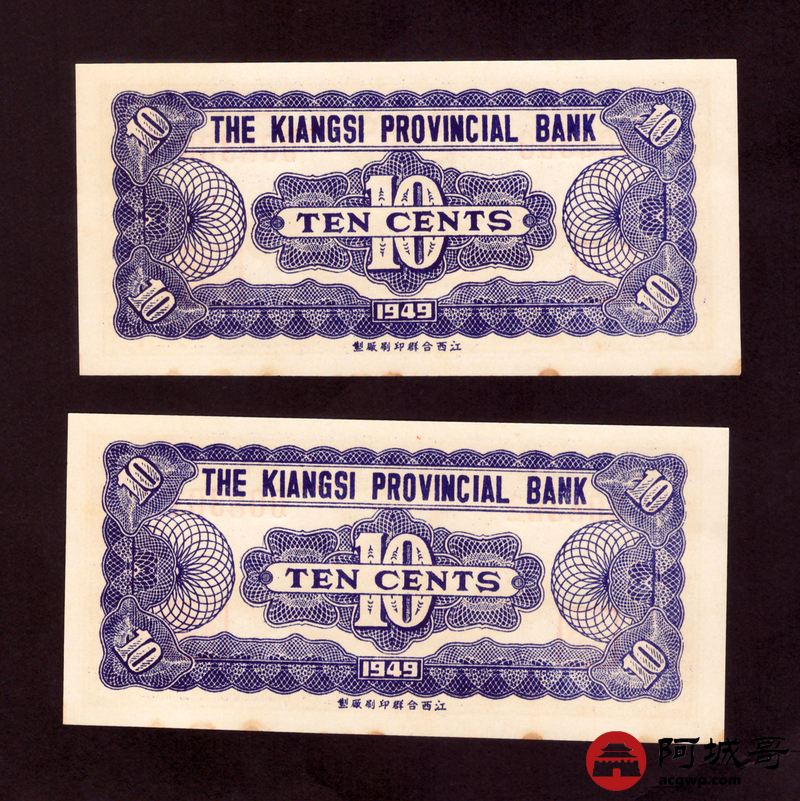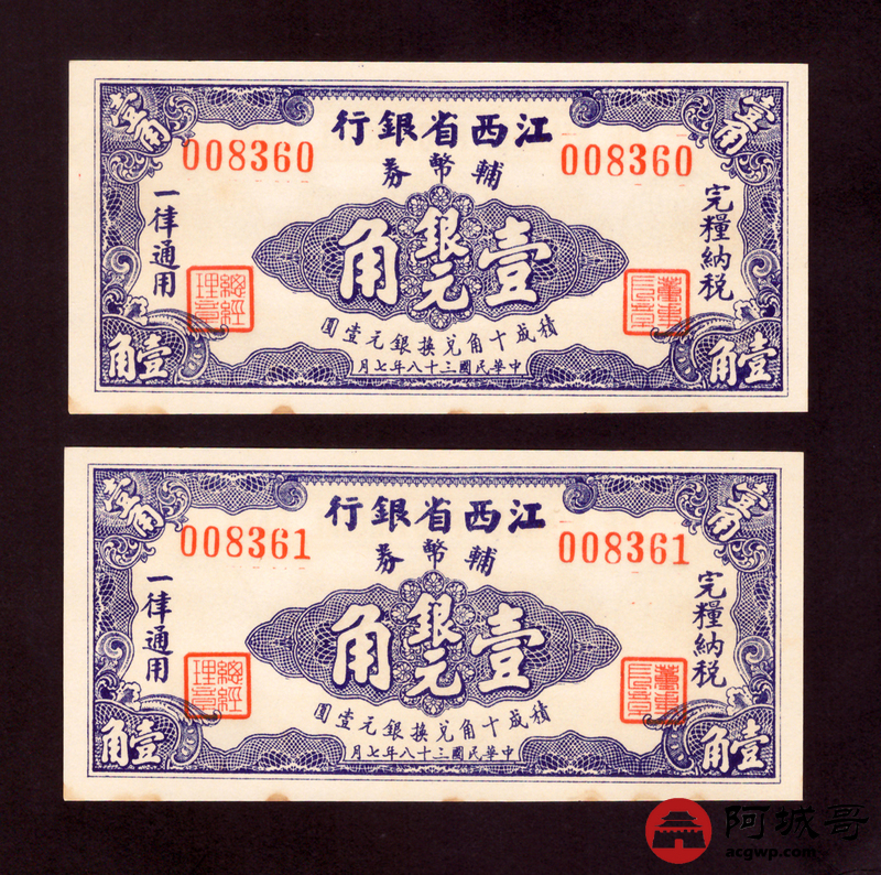 Lot:23 民国三十八年 江西省 辅币券 银元壹角 2张连号 95至全新 好号无47