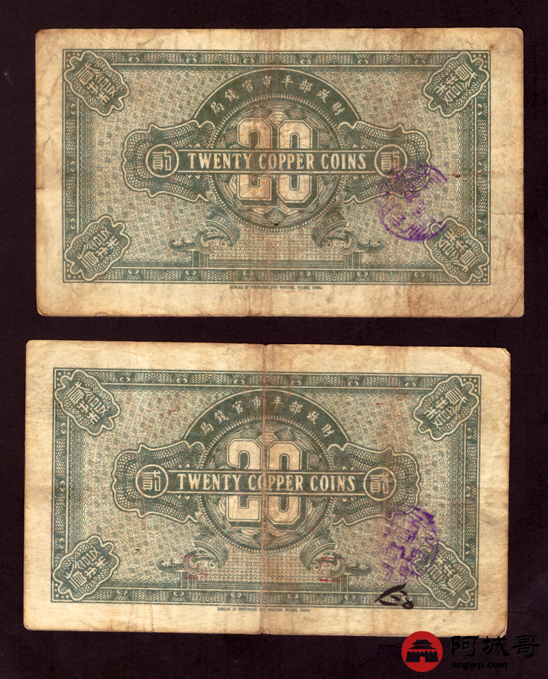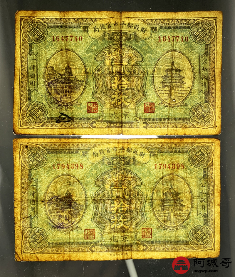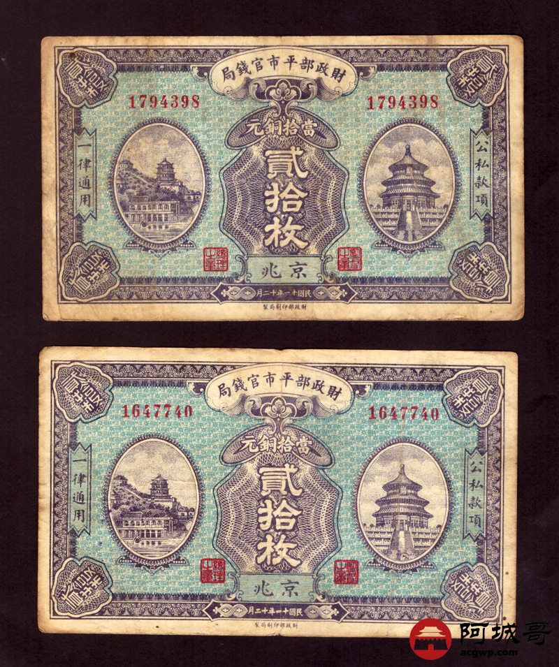 Lot:48 民国十一年 财政部平市官钱局 当拾铜元 贰拾枚 京兆地名 2张 69至7成新