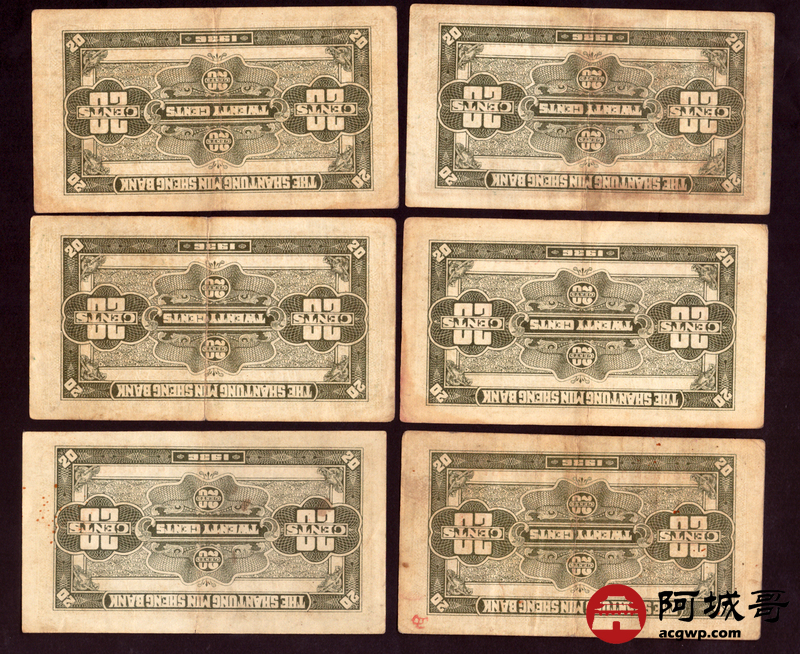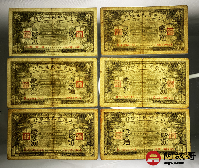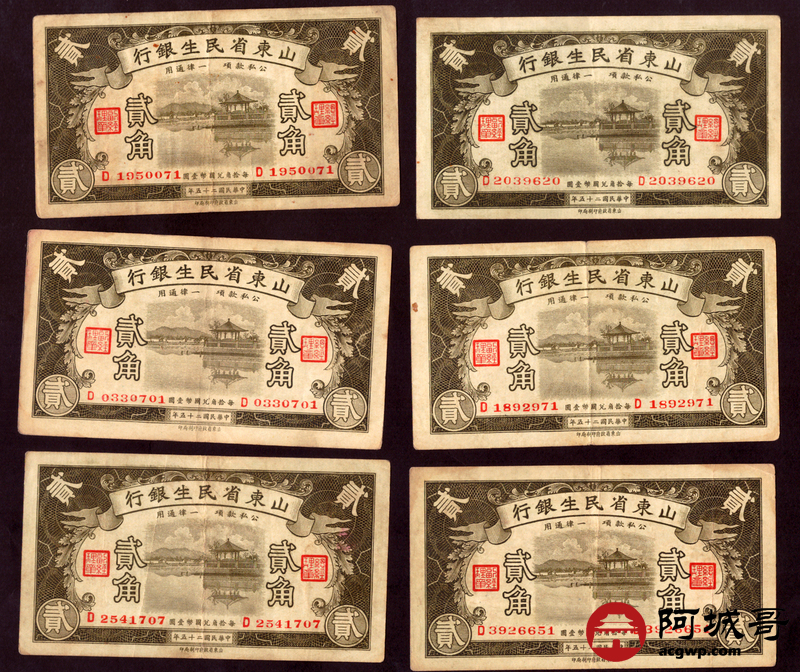 Lot:54 民国25年 山东省民生银行 贰角 6张 69至73成新