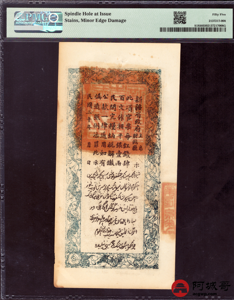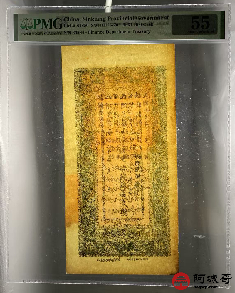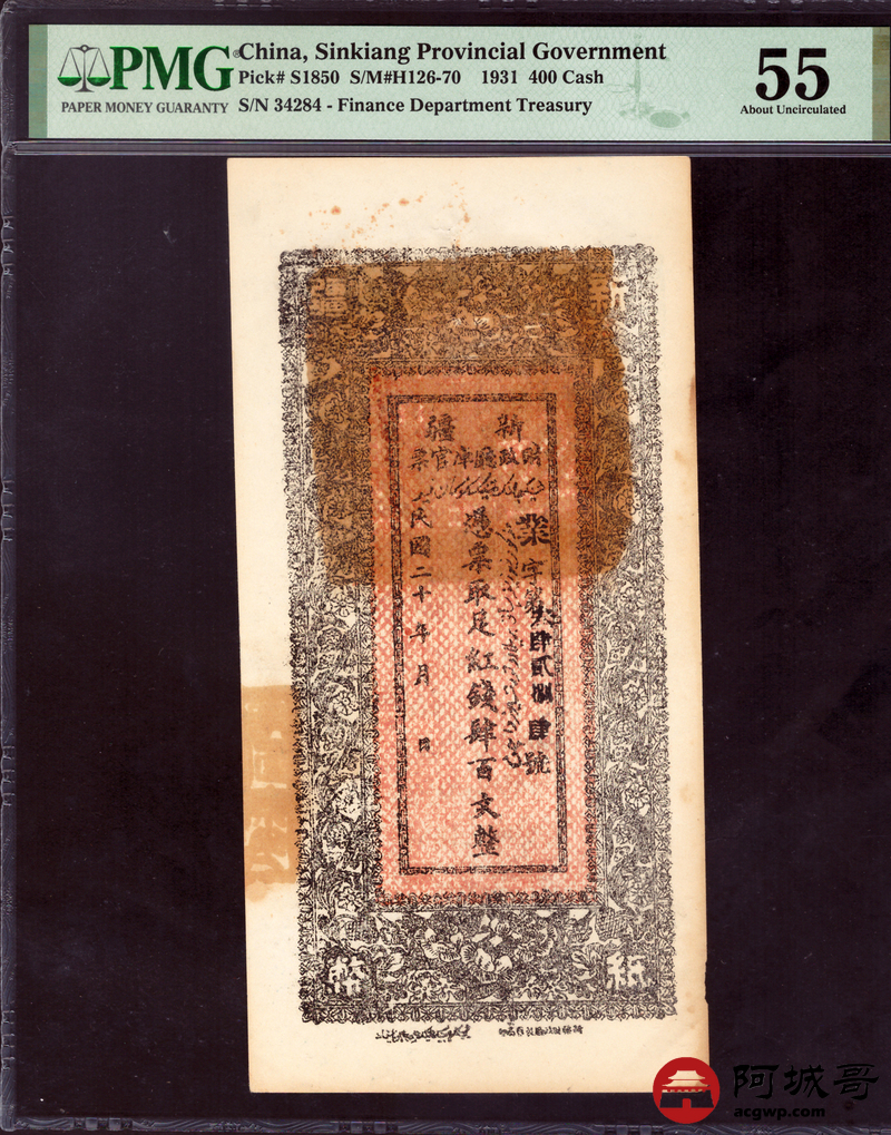 Lot:33 民国二十年 新疆财政厅库官票 红钱肆佰文整 PMG 55
