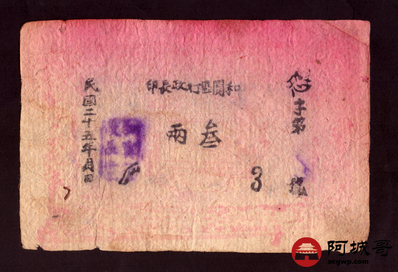 Lot:7 民国二十五年 和田区行政长印 叁两 好品少见