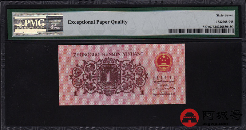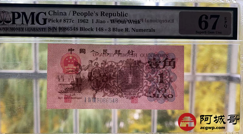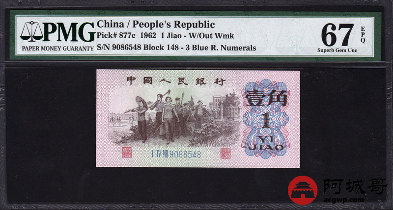 Lot:38 三版 1962年 壹角 蓝3冠 平版 PMG 67EPQ 尾号8