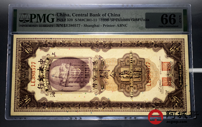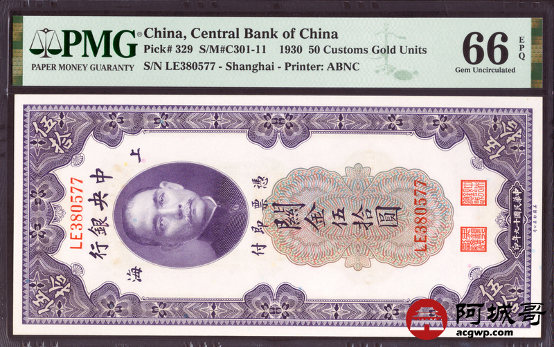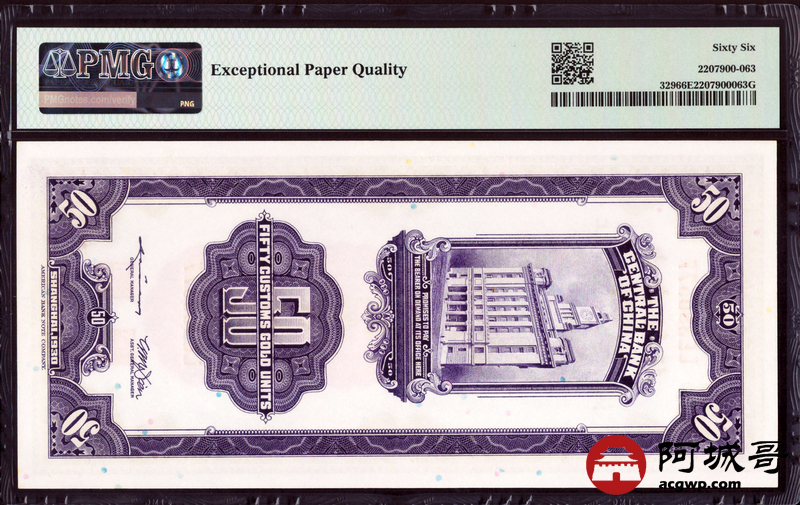 Lot:16 民国十九年 中央银行 关金伍拾圆 上海地名 PMG 66EPQ
