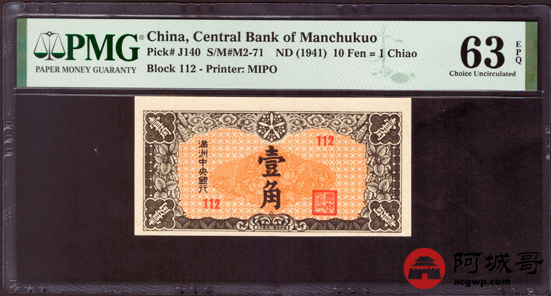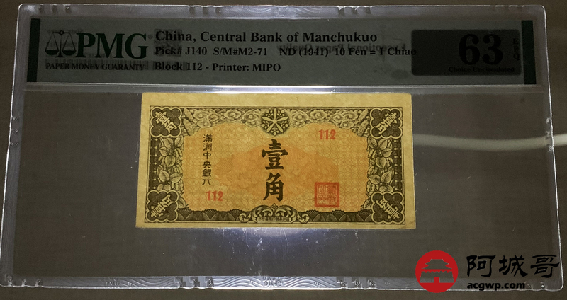 Lot:51 满洲中央银行 壹角 PMG 63EPQ