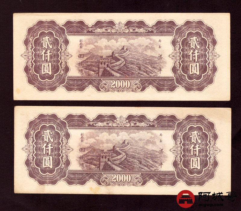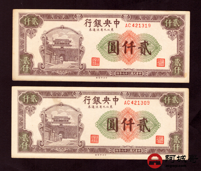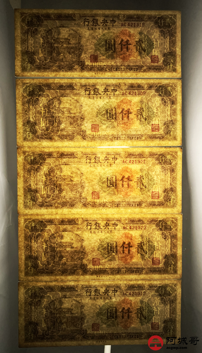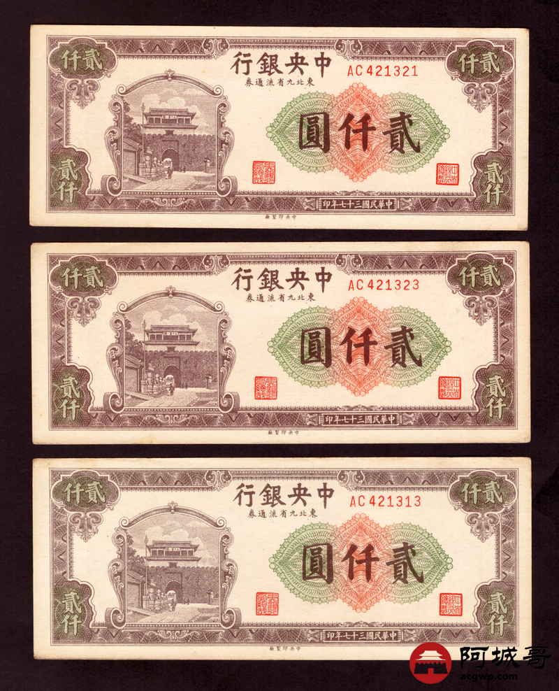 Lot:42 民国三十七年 中央壹圆 东北九省流通券 贰仟圆 跳连五张 原票板子硬9成新
