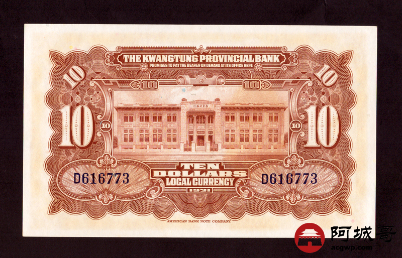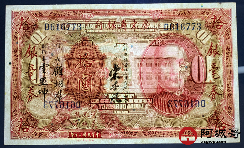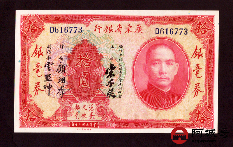 Lot:1 民国二十年 广东省银行 银毫券拾圆 原票97至全新