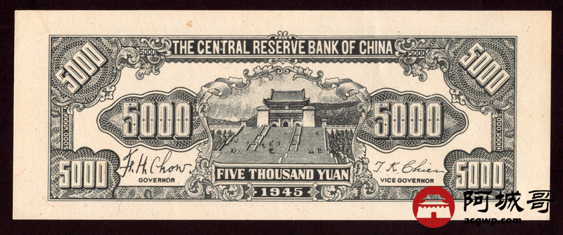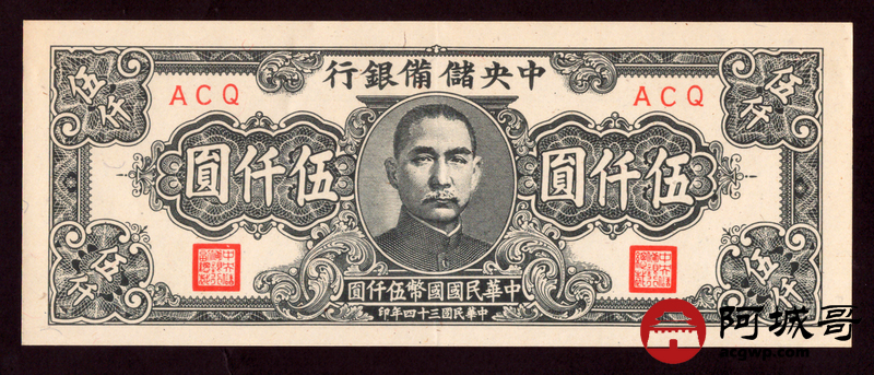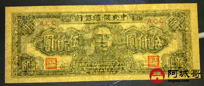 Lot:66 民国三十四年 中央储备银行 伍仟圆 原票板子硬88至9成新