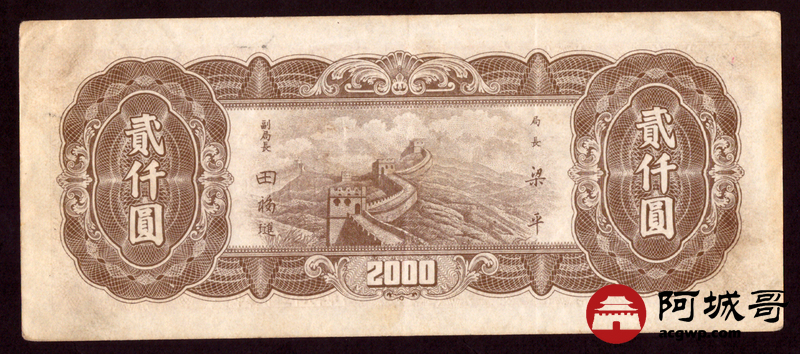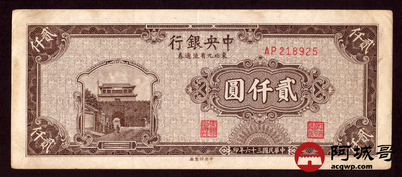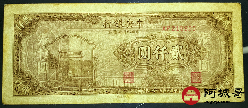 Lot:30 民国三十六年 中央银行 贰仟圆 板子硬88成新