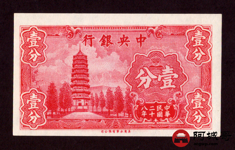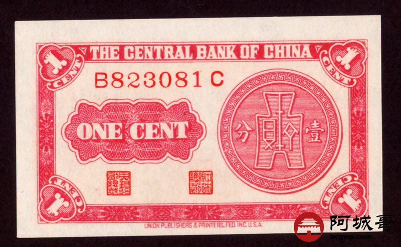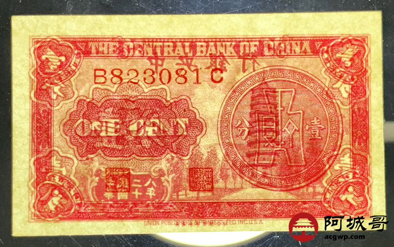 Lot:39 民国二十八年 中央银行 壹分 原票92成新 好号无47