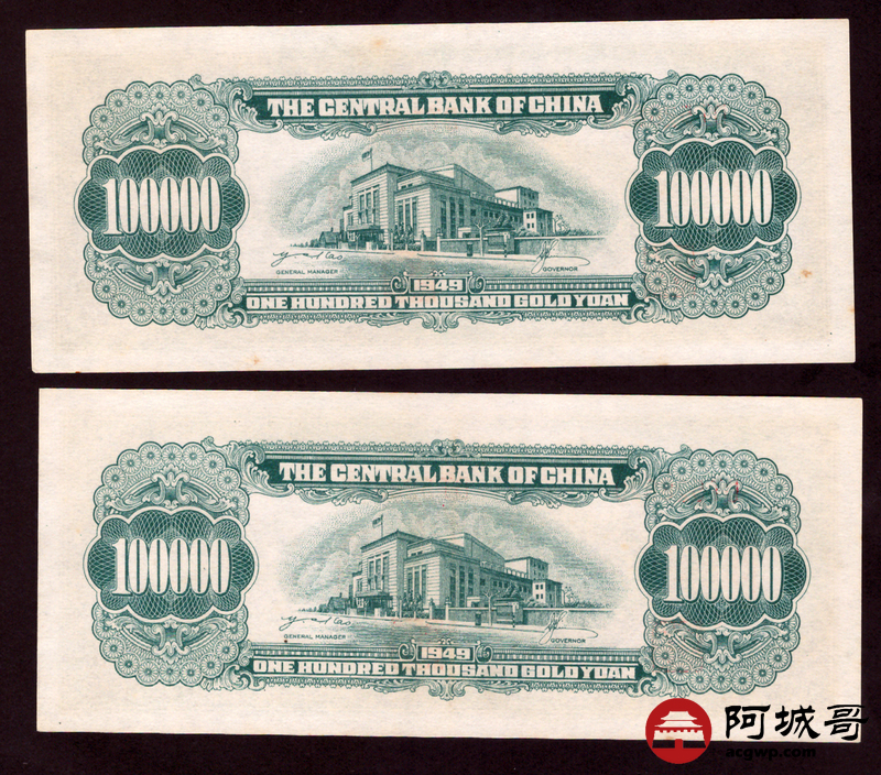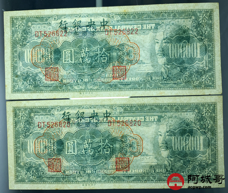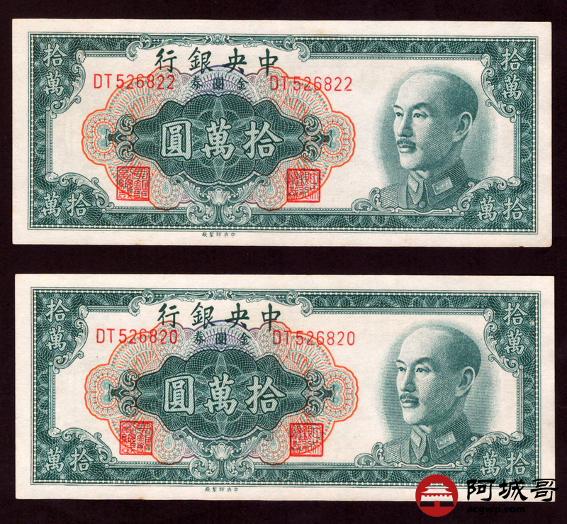 Lot:72 1949年 中央银行 金圆券拾萬圆 2张 9至92成新