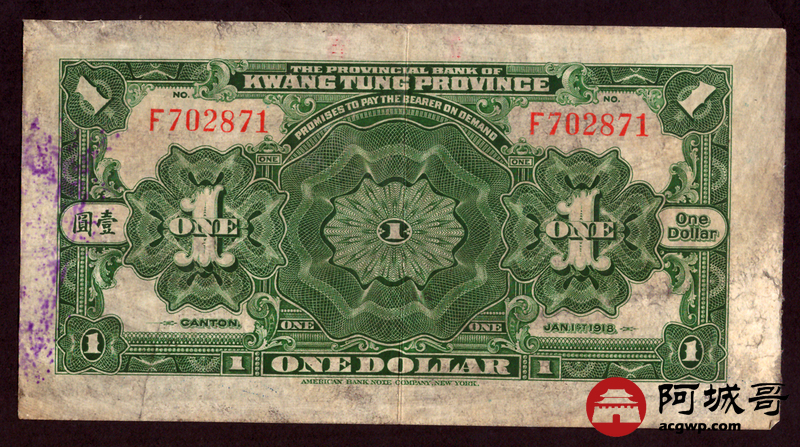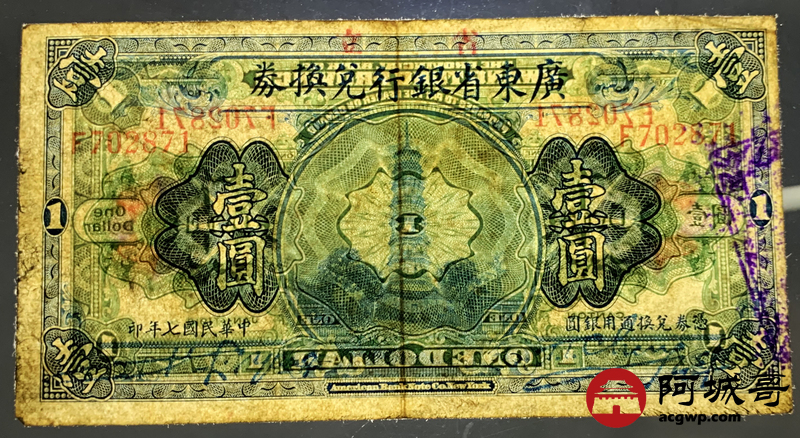 Lot:11 广东省银行兑换券 壹圆 约7成新