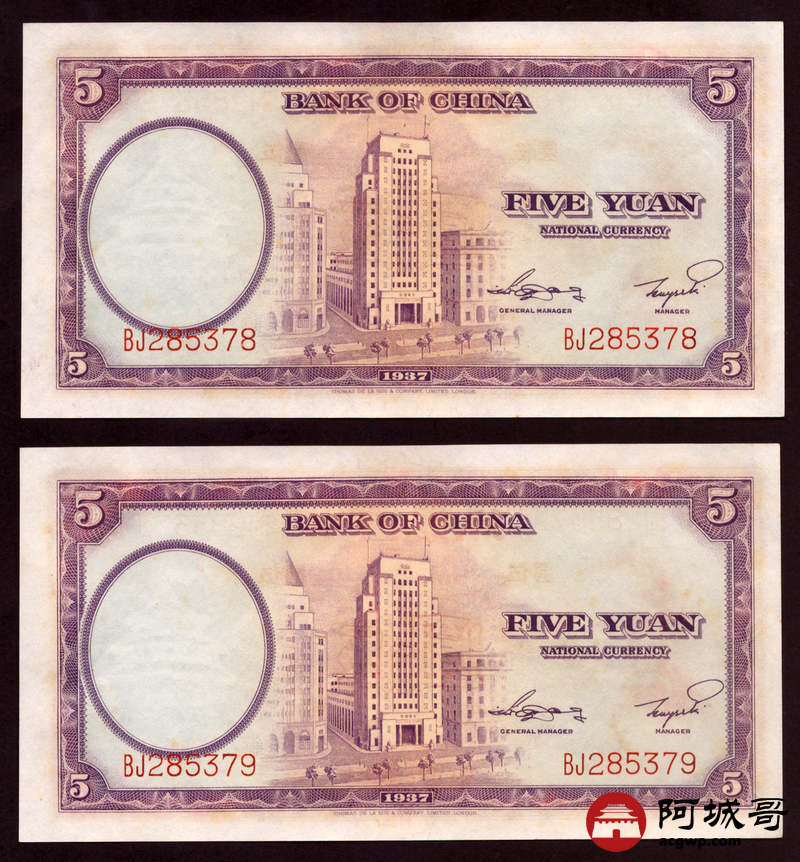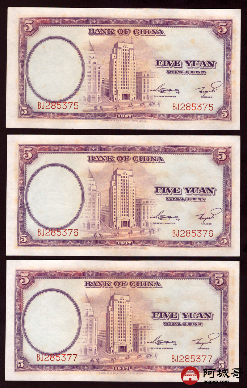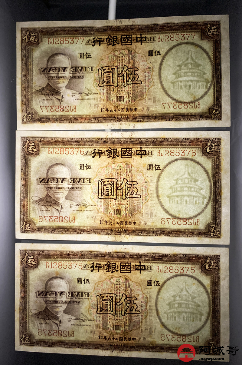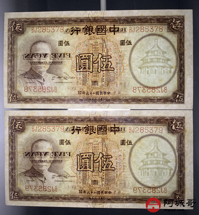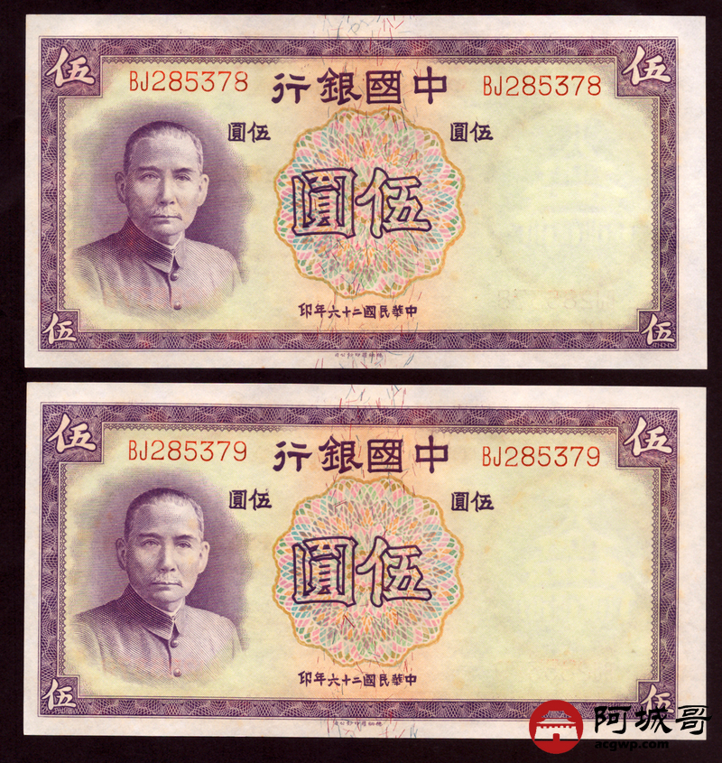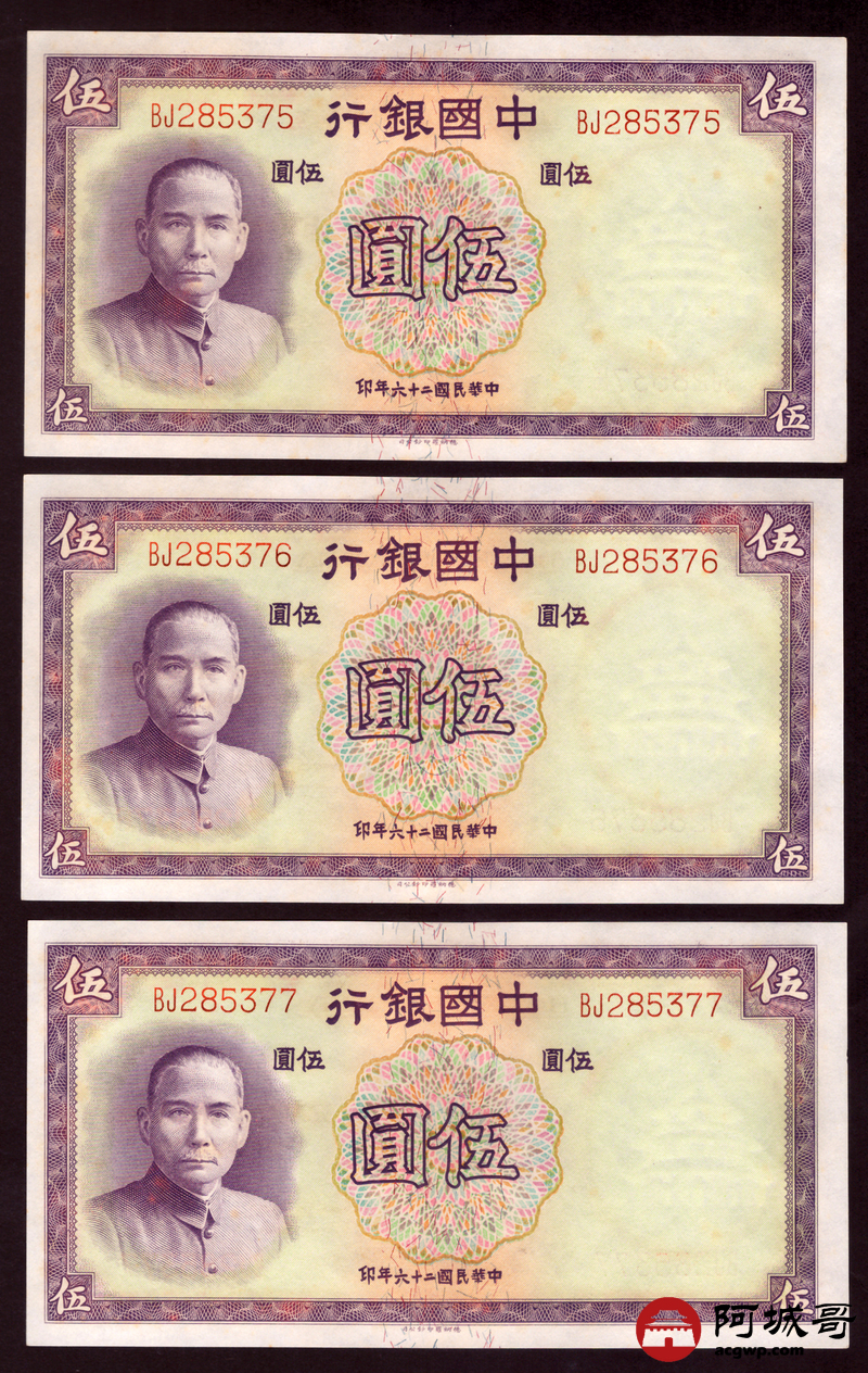 Lot:46 民国二十六年 中国银行 伍圆 五张连号 原票 微有黄斑94至全新