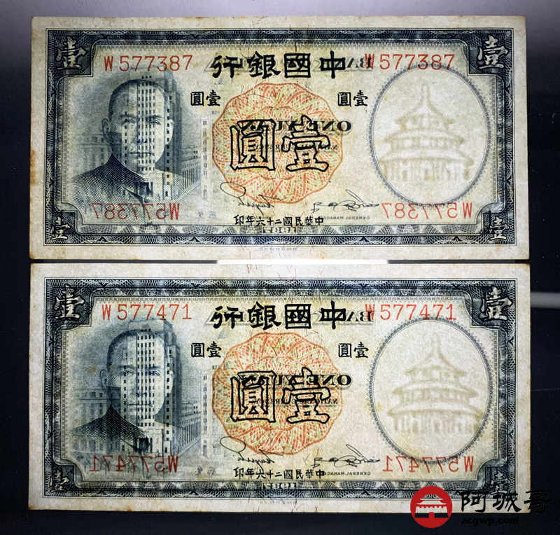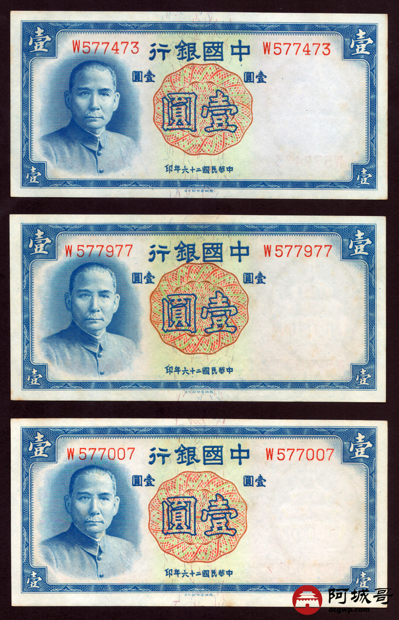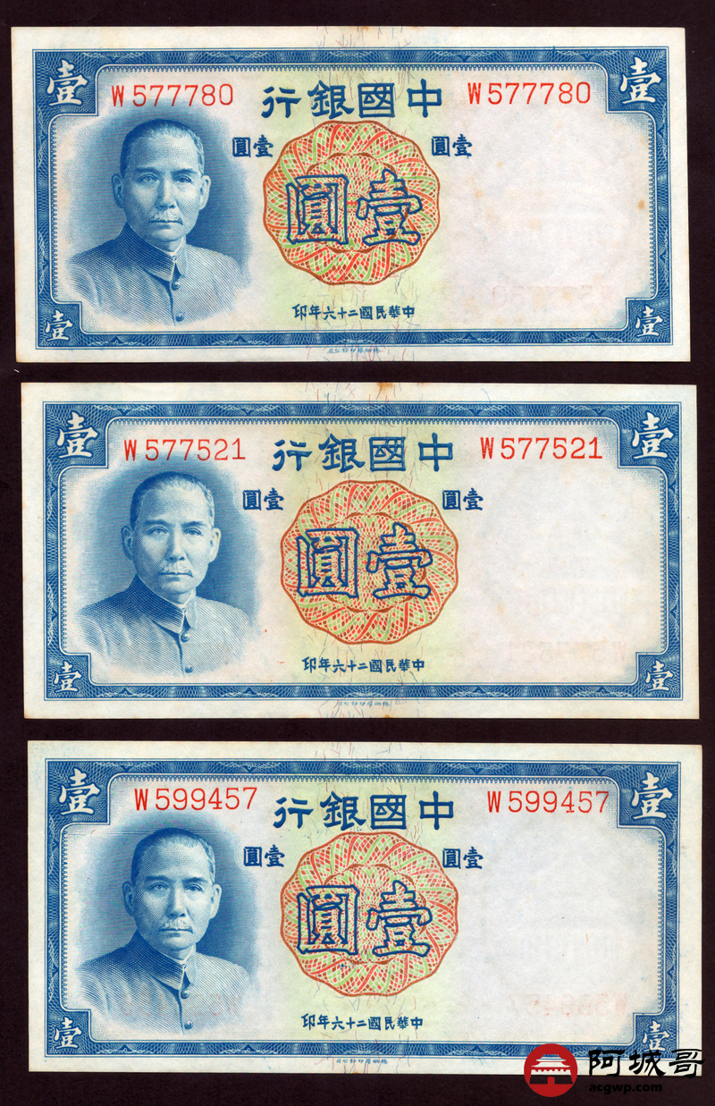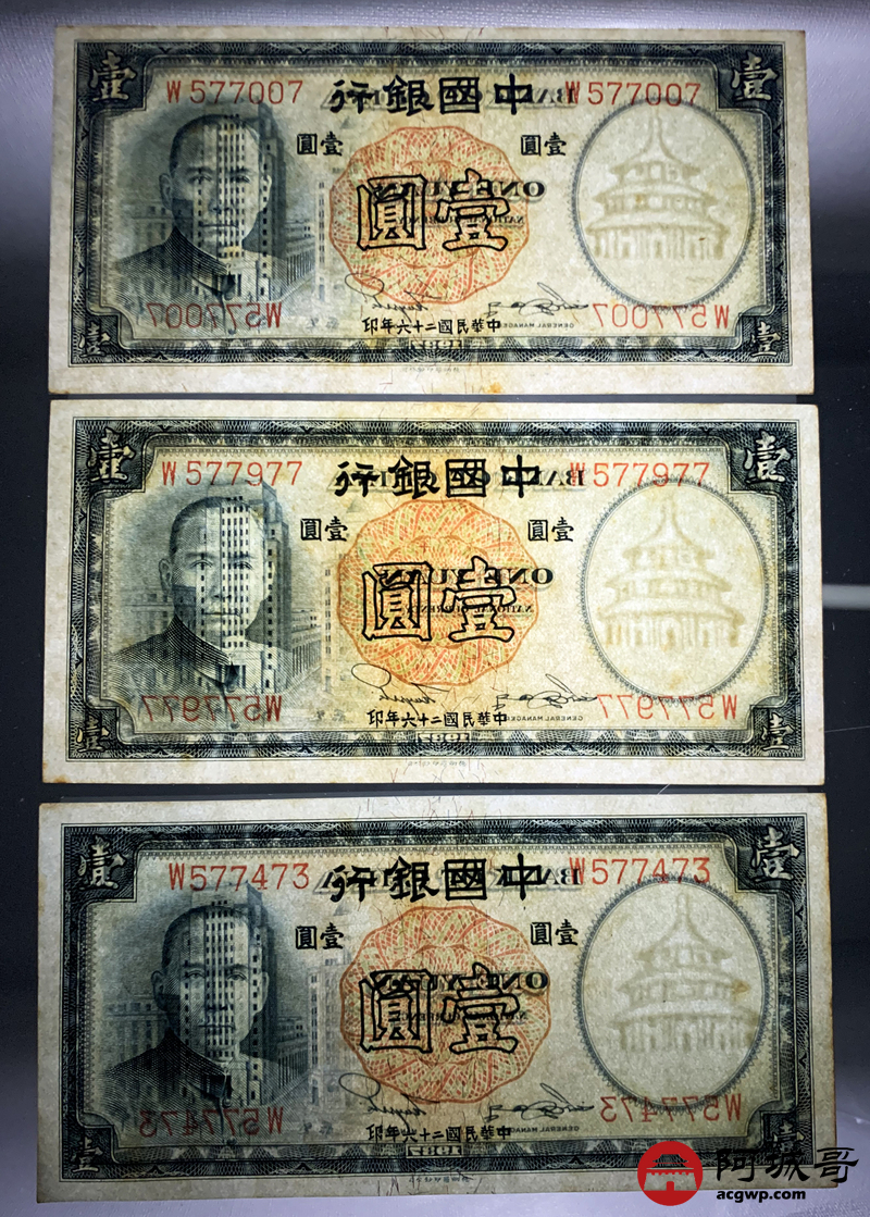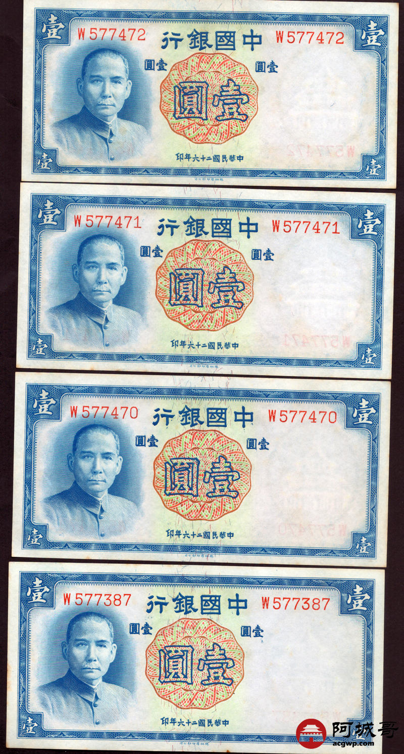 Lot:67 民国二十六年 中国银行 德纳罗版壹圆 十张 原票微有黄斑9张94成新1张92成新