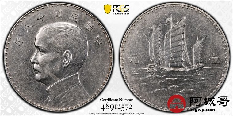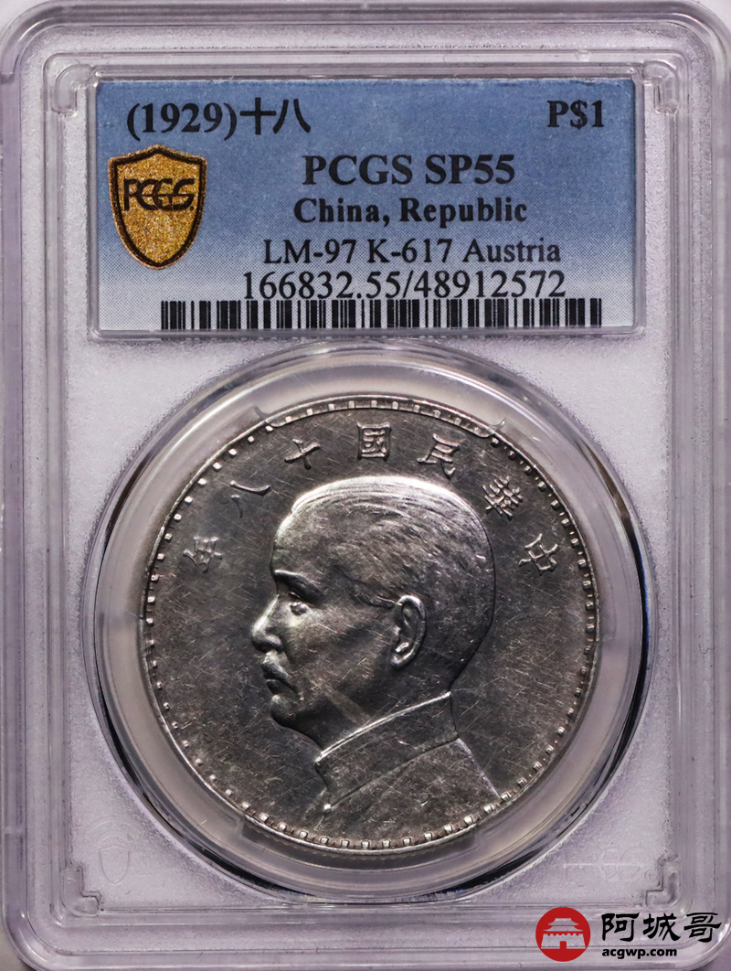 Lot:14 镜面深打 民国十八年奥地利版三帆样币 PCGS SP55