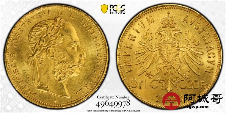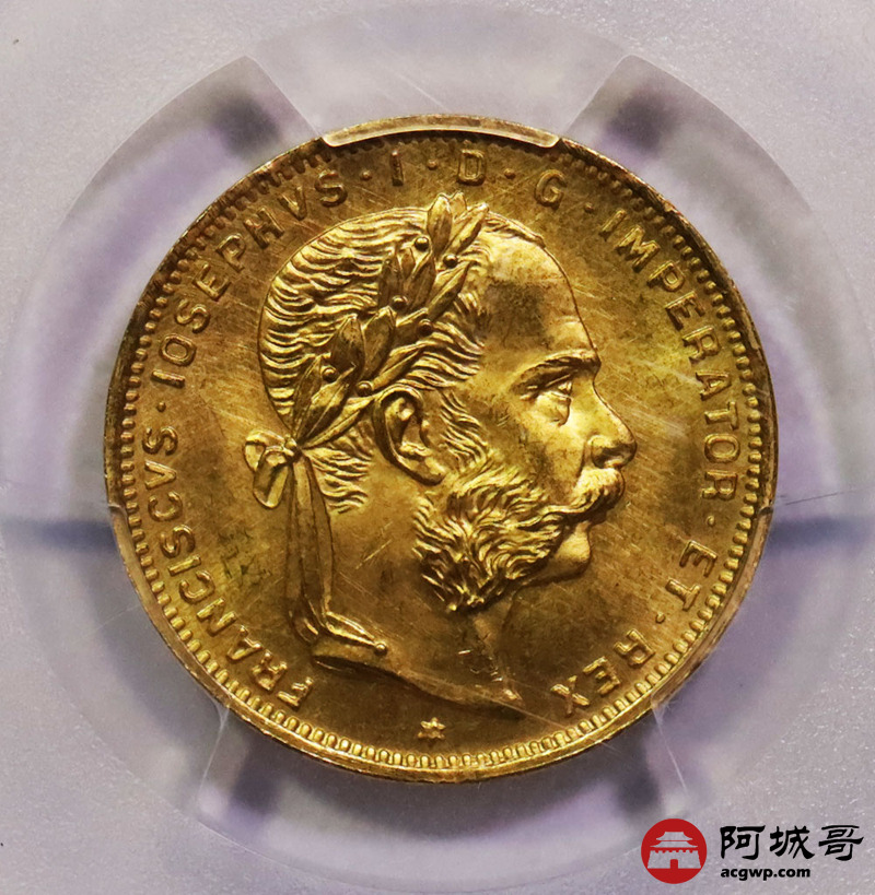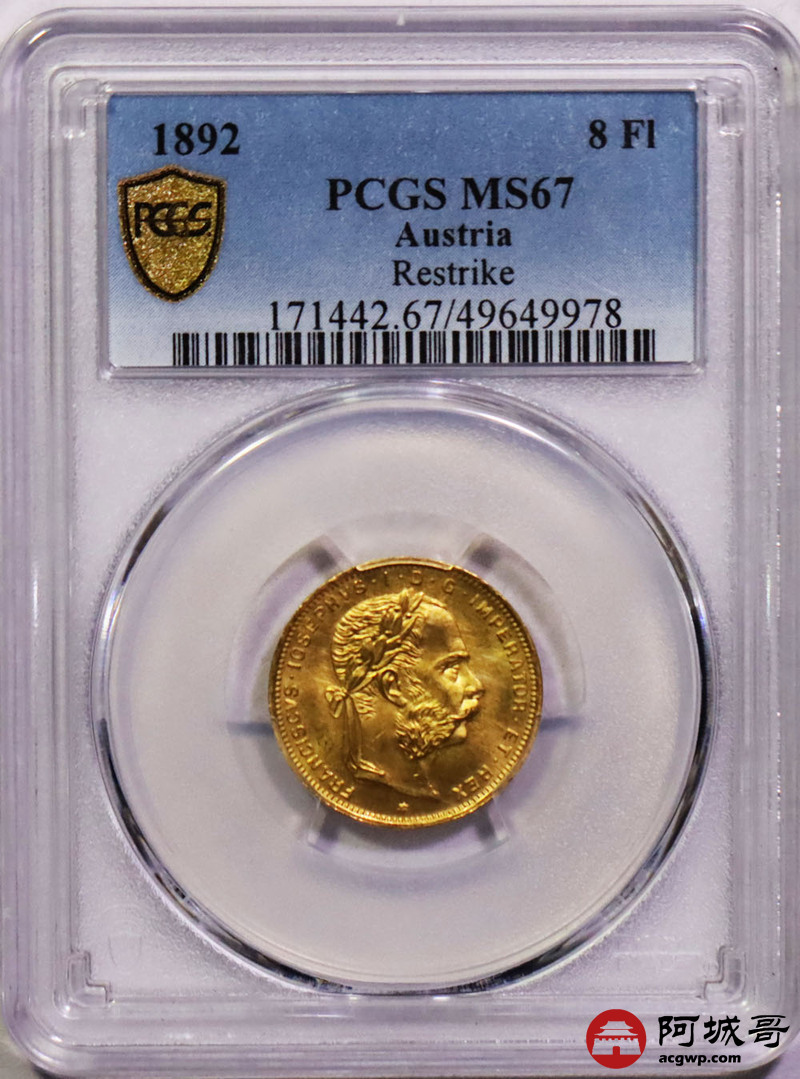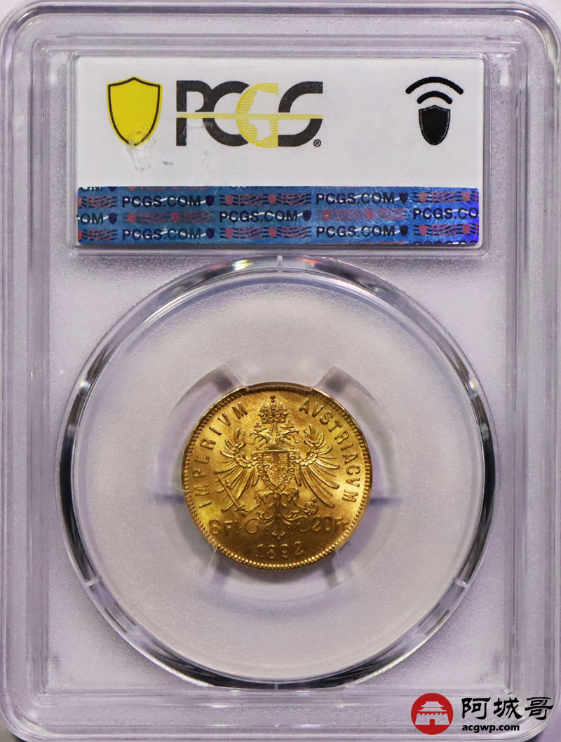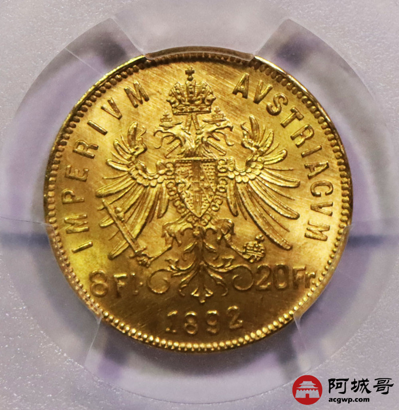 Lot:13 1892年奥匈帝国8佛罗林20法郎金币 PCGS MS67