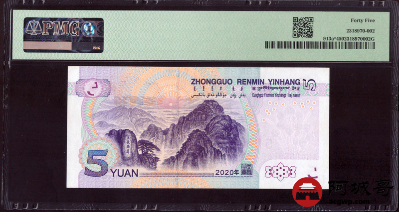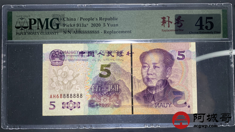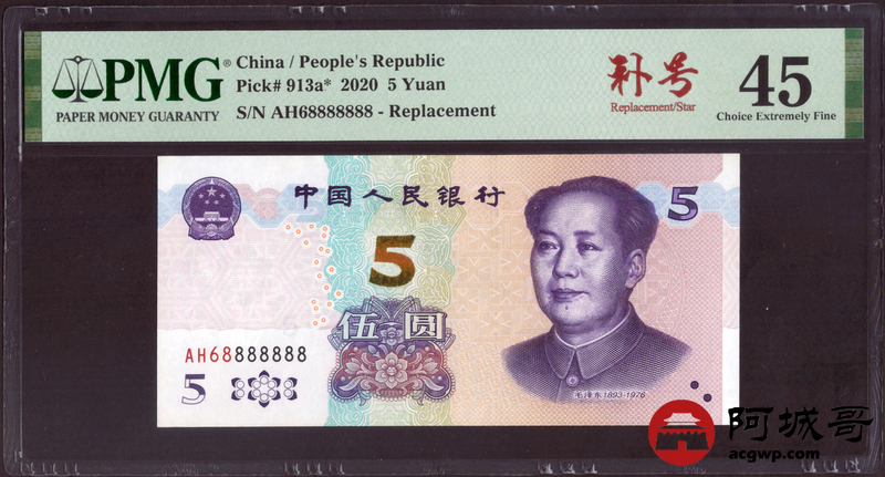Lot:16 中国人民银行伍圆 PMG 45 补号券、倒置号