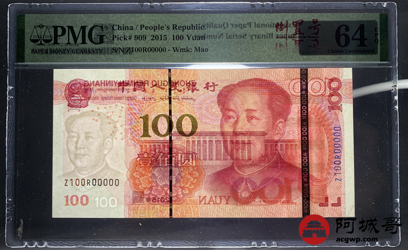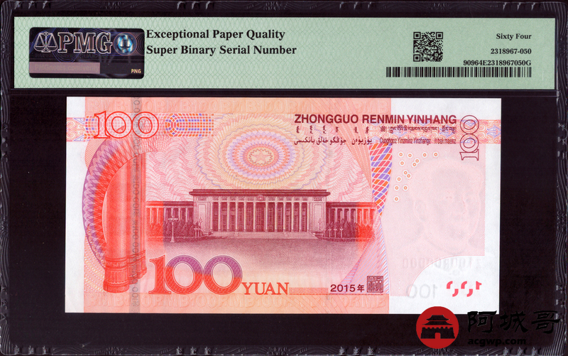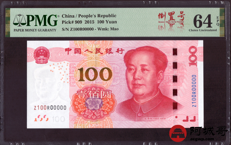 Lot:26 15年 中国人民银行壹佰圆 PMG 64EPQ 倒置号、二进制号