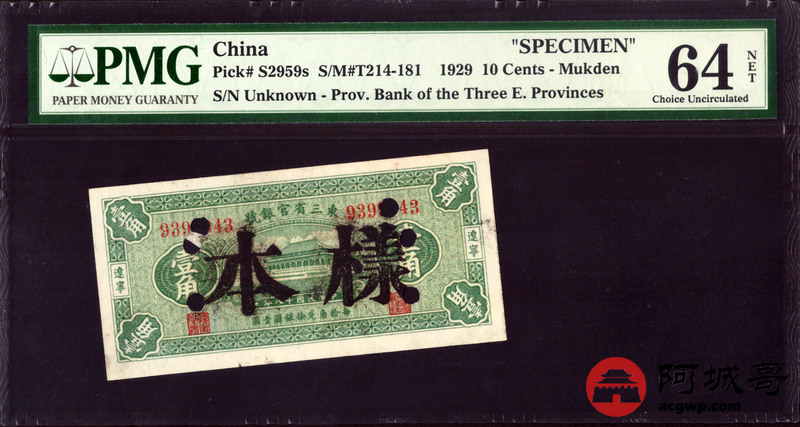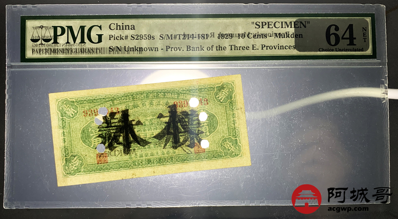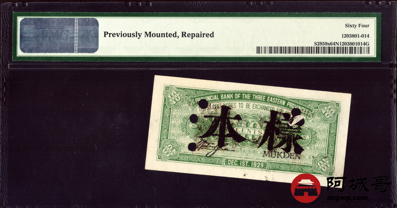 Lot:44 民国十八年 东三省官银号 壹角 辽宁地名 PMG 64 实票改样票