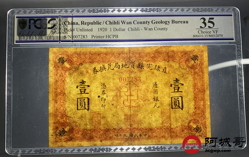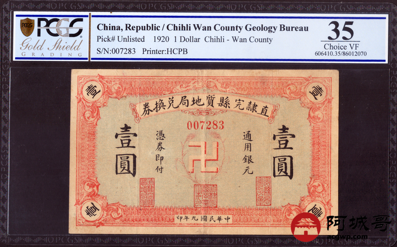 Lot:8 民国九年 直隶完县质地局 兑换券 壹圆 PCGS VF35