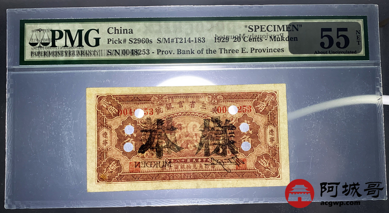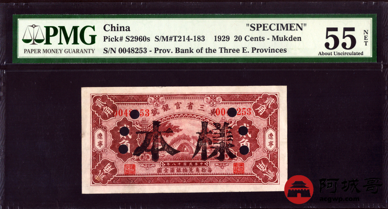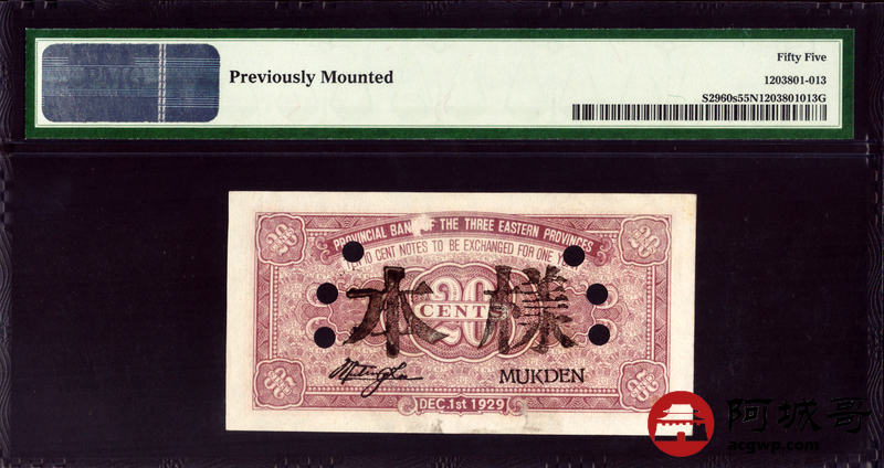 Lot:18 民国十八年 东三省官银号 贰角 辽宁地名 实票改样票 PMG 55