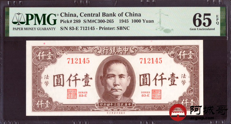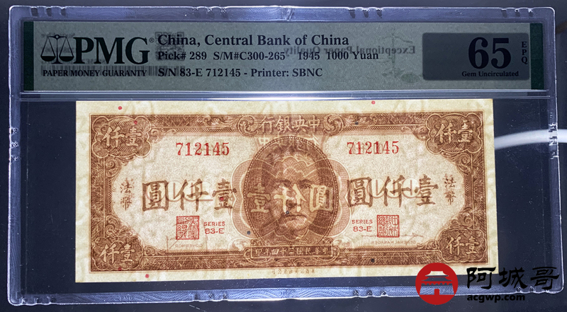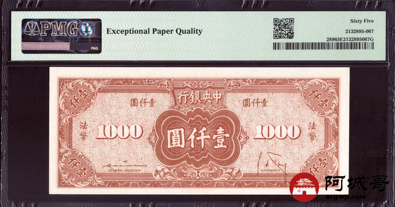 Lot:36 民国三十四年 中央银行 壹仟元 PMG 65EPQ