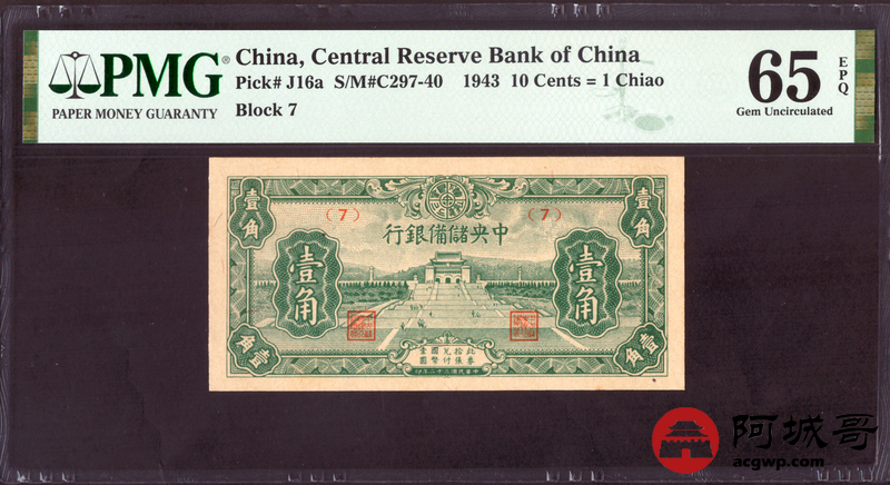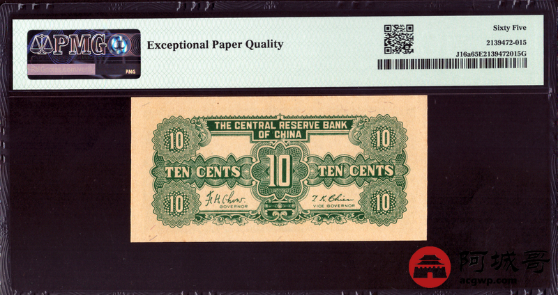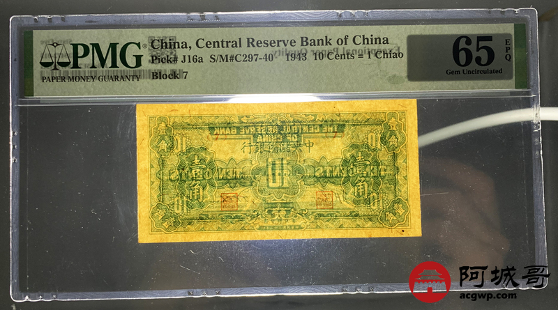 Lot:61 民国三十二年 中央储备银行 壹角 PMG 65EPQ