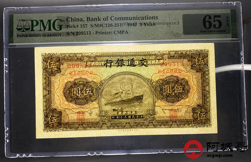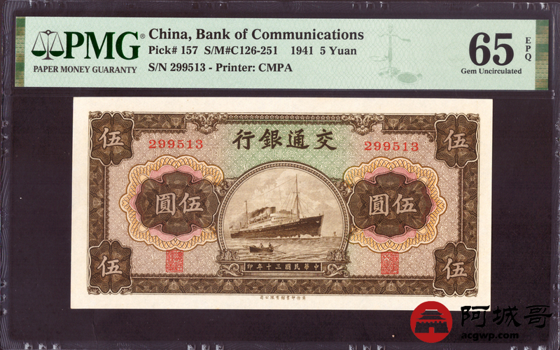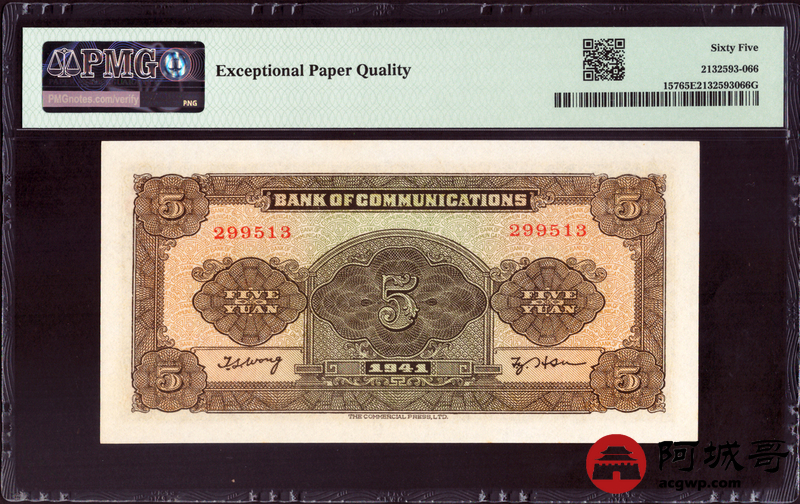 Lot:37 民国三十年 交通银行 伍圆 PMG 65EPQ