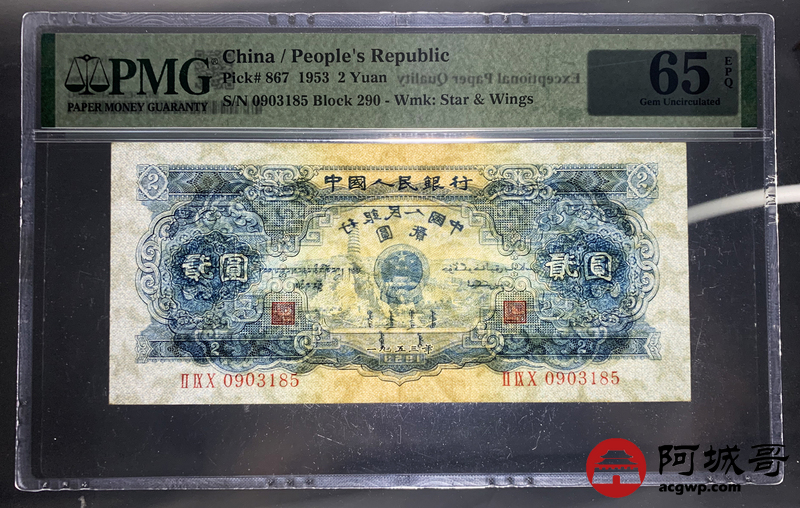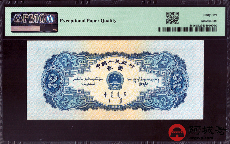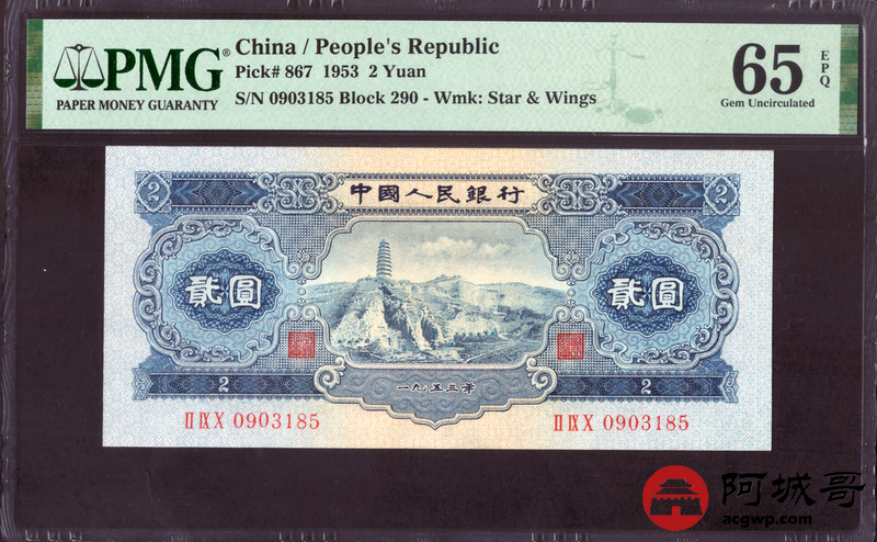 Lot:11 二版 1953年 宝塔山2元 PMG 65EPQ 好号无47