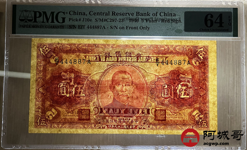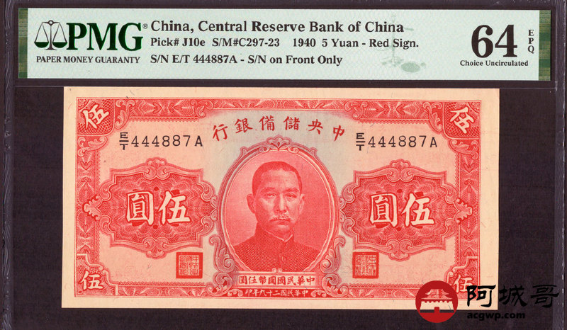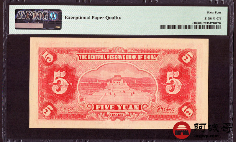 Lot:62 民国二十九年 中央储备银行 伍圆 PMG 64EPQ