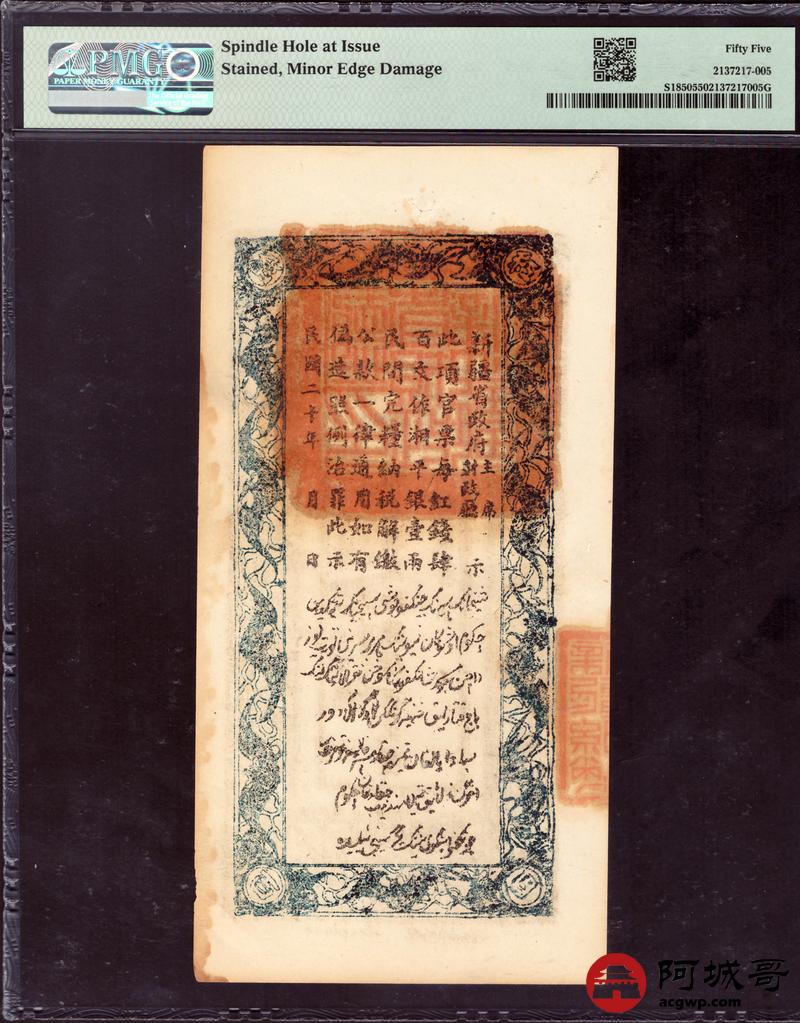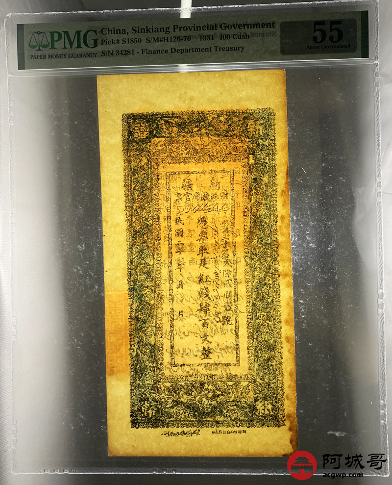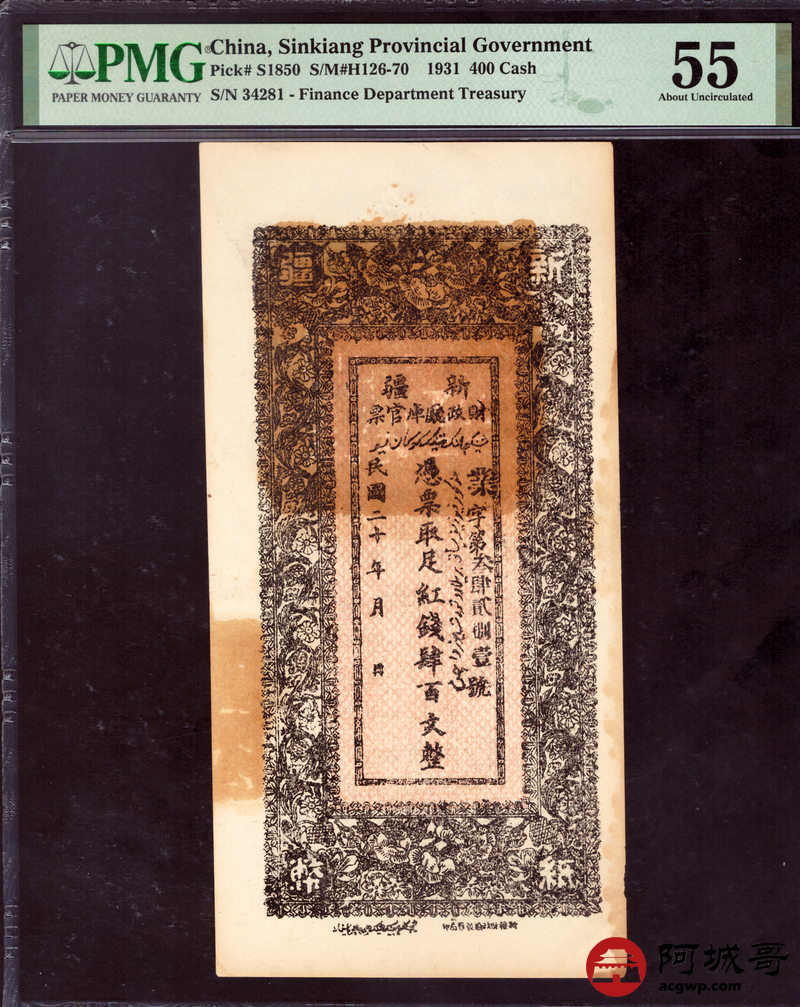 Lot:4 民国二十年 新疆财政厅库官票 红钱肆佰文整 PMG 55