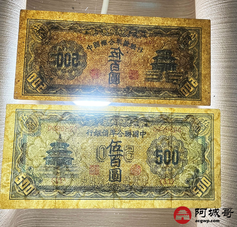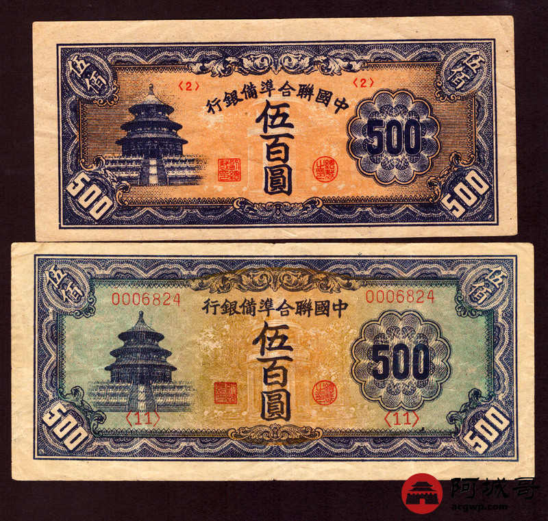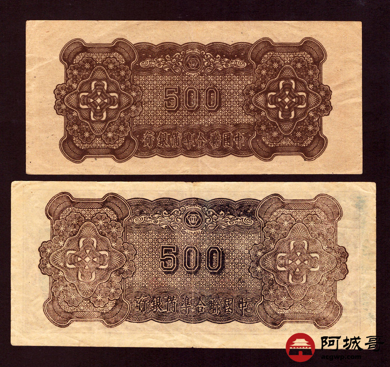 Lot:63 中国联合准备银行 伍佰圆 两张 短号有针孔74成新 长号有裂68成新