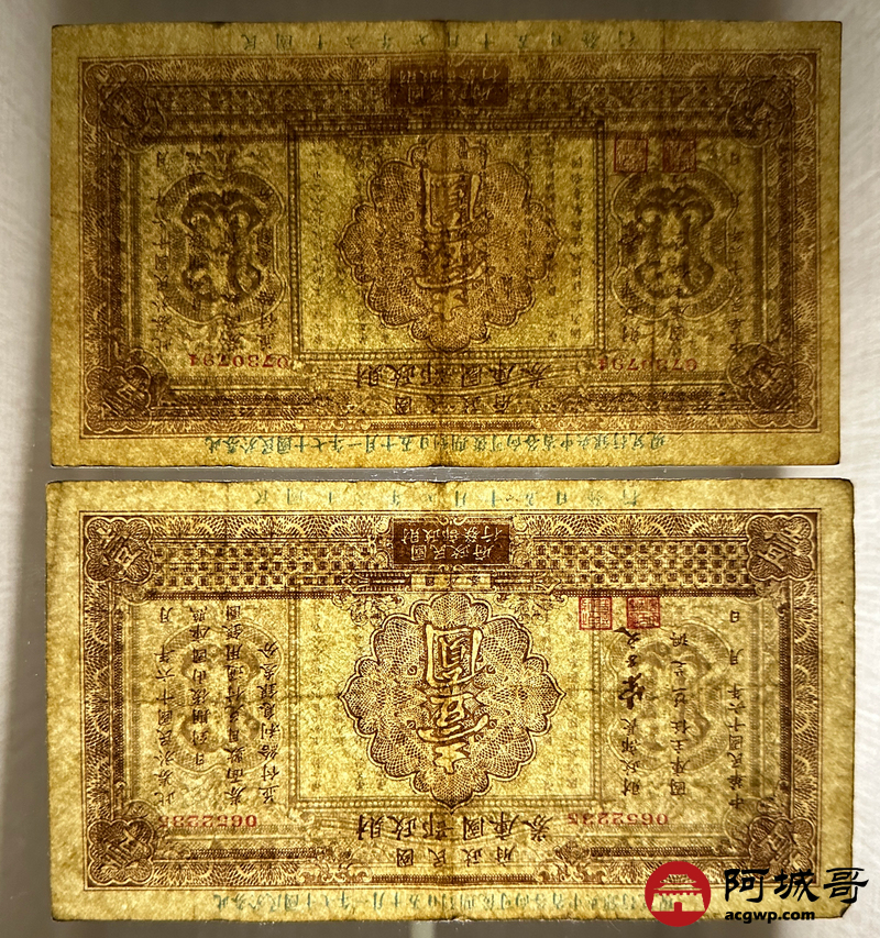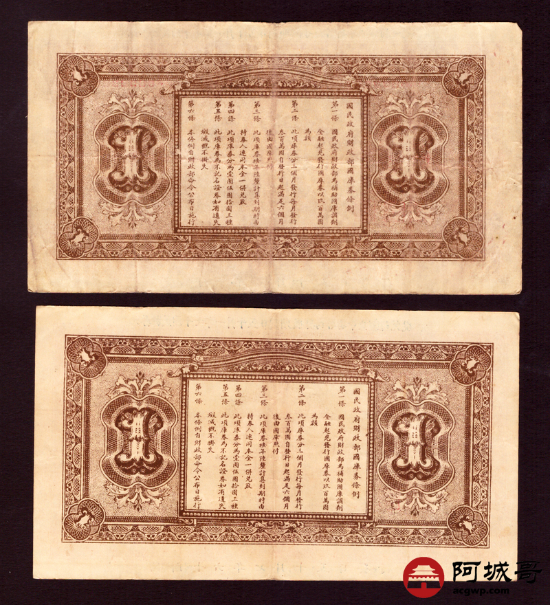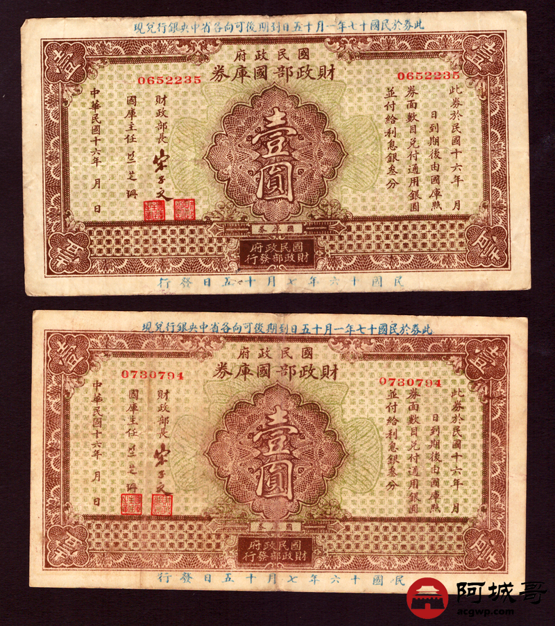 Lot:56 民国16年 民国政府财政部国库券 壹圆 7成新 两张一组