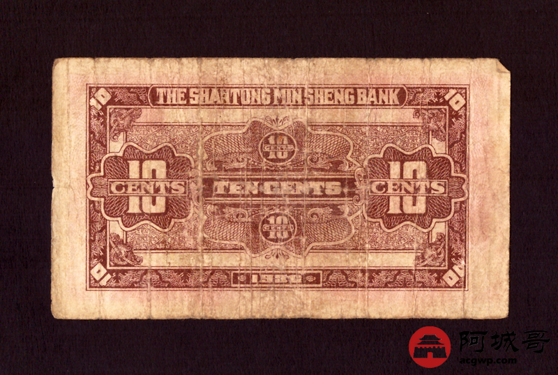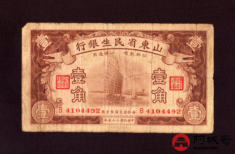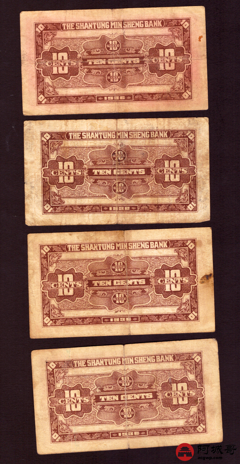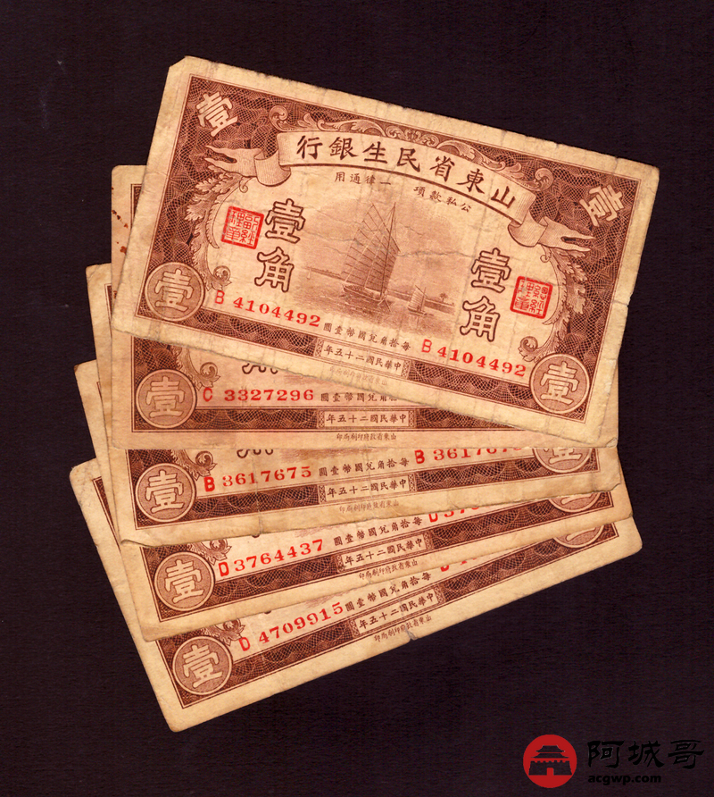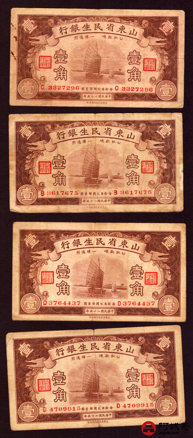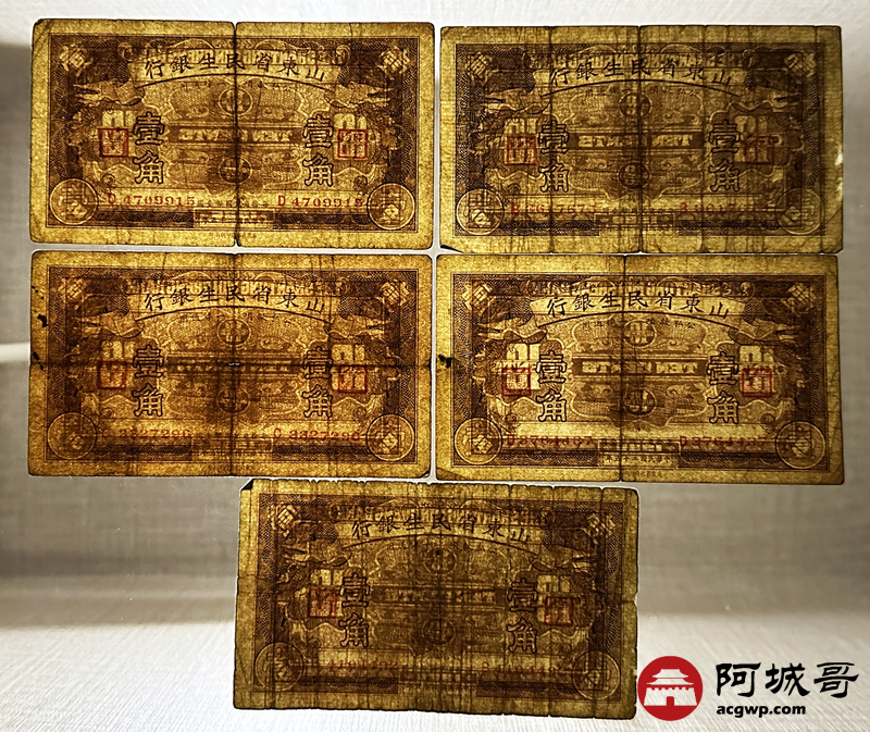 Lot:34 民国25年 山东省民生银行 壹角 5张一组 一张72成新4张69成新