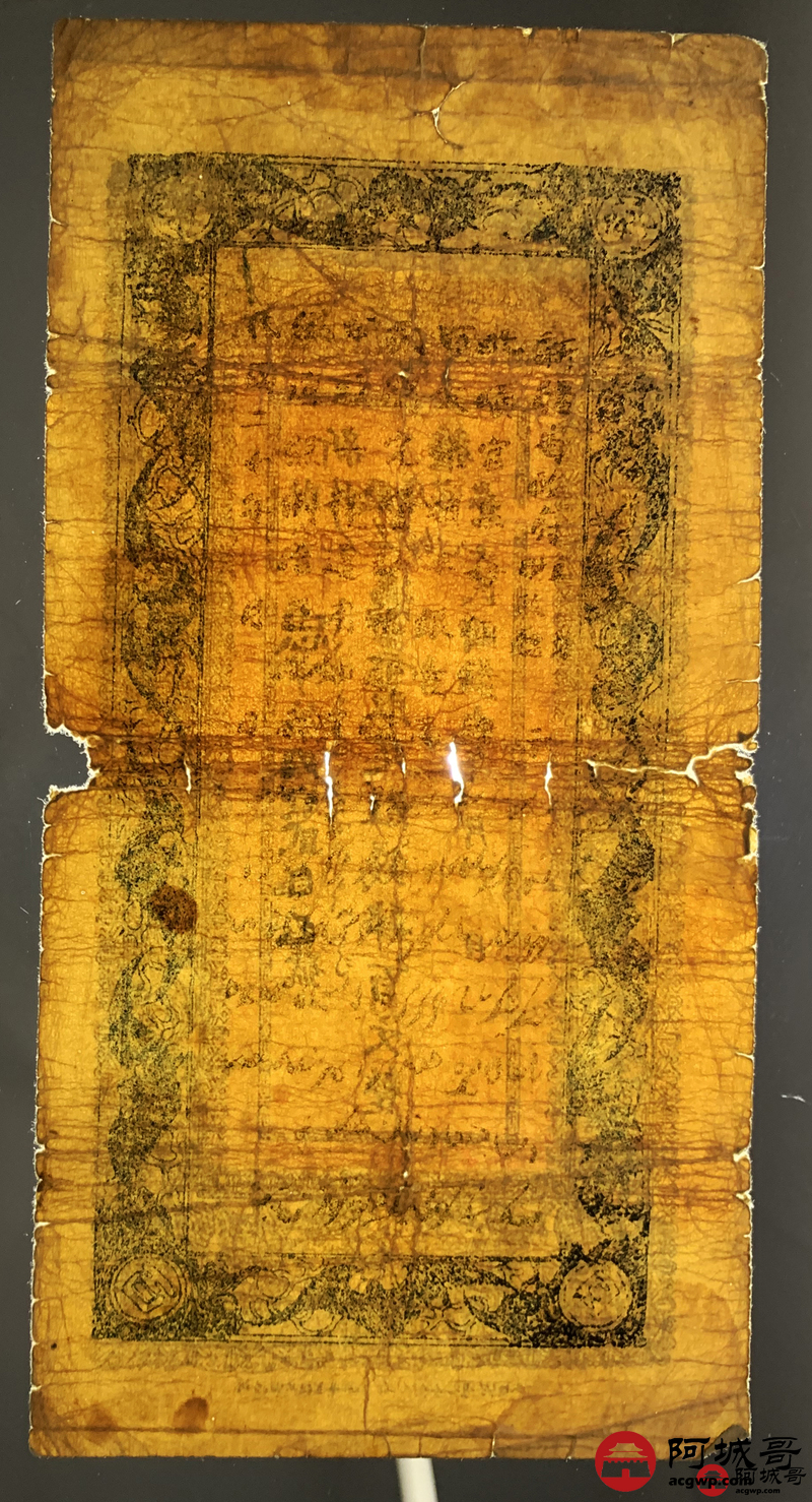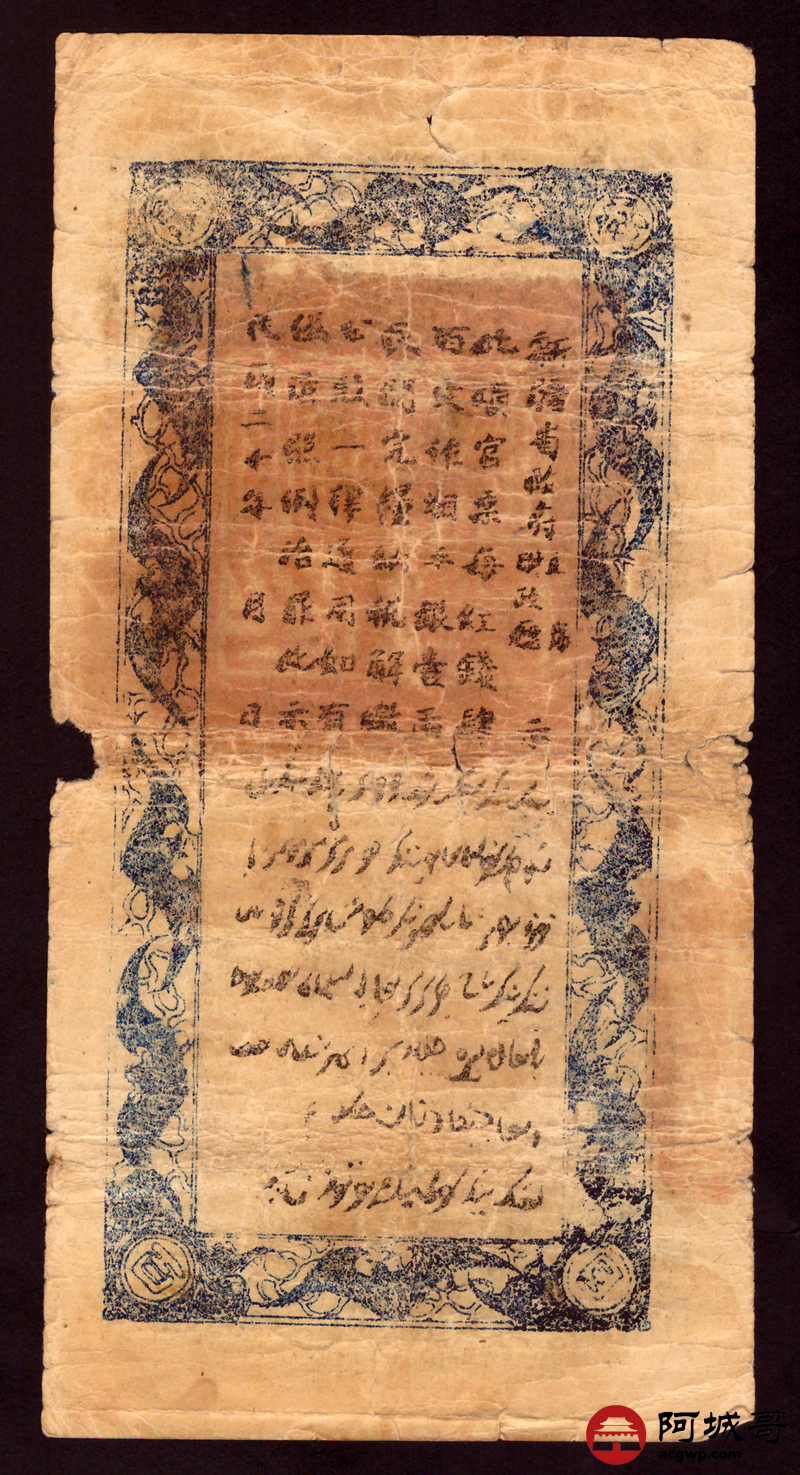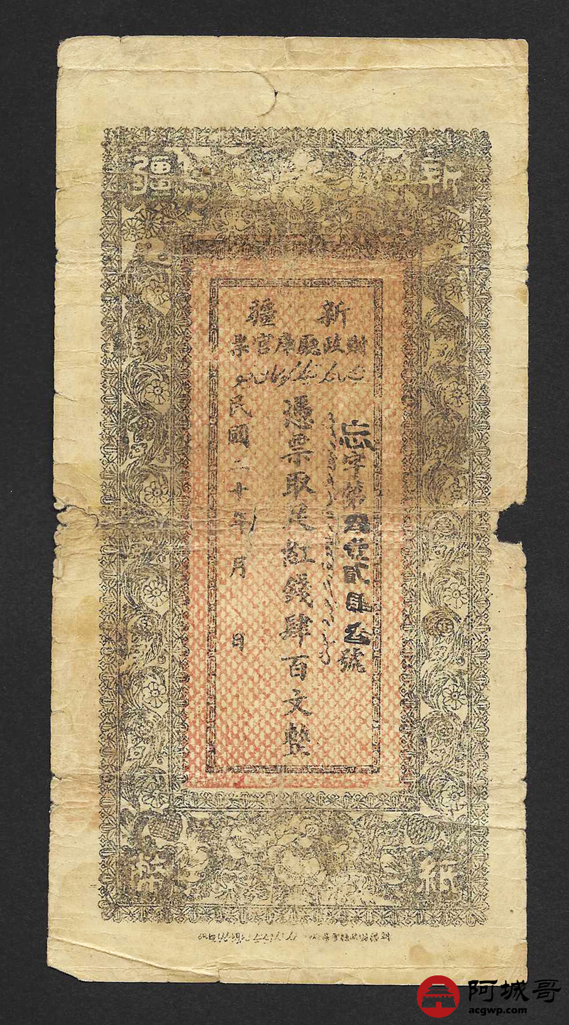 Lot:69 民国二十年 新疆财政厅库官票 红钱肆佰文整 6成新