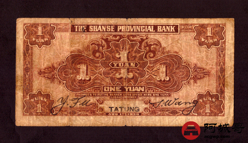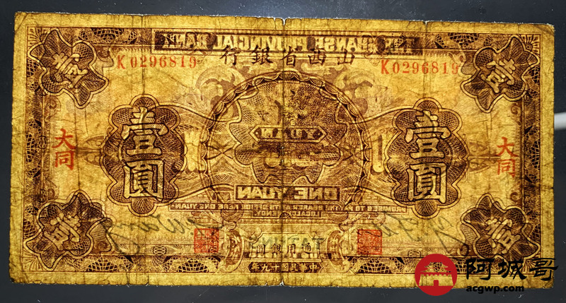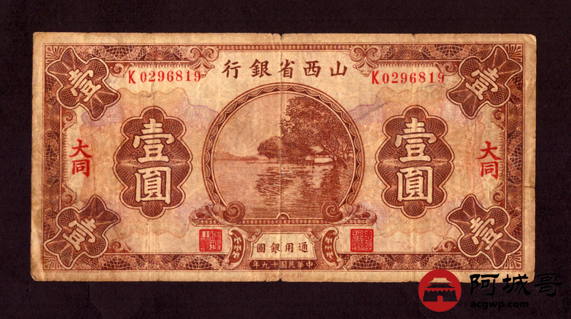 Lot:27 民国十九年 山西省银行 壹圆 大同地名 69成新