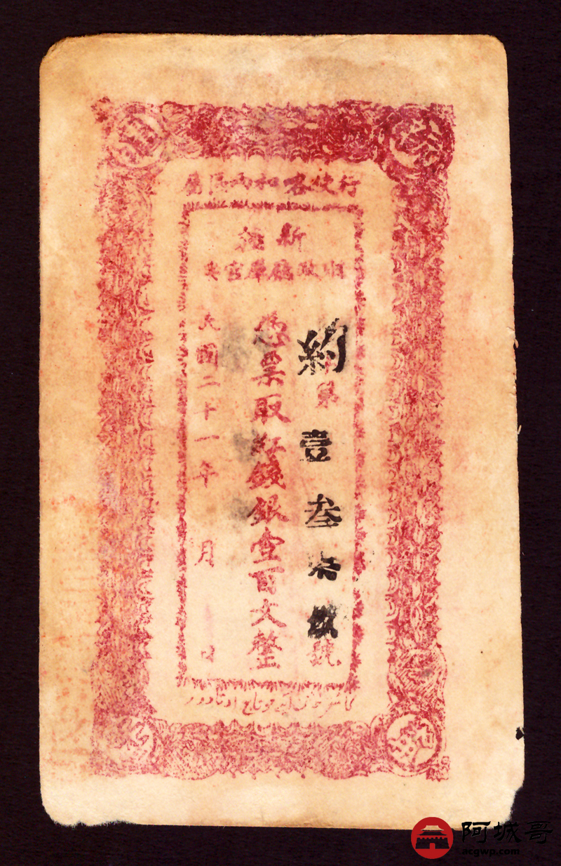 Lot:54 民国21年 新疆财政厅库官票行使喀和两区 壹佰文整 72成新