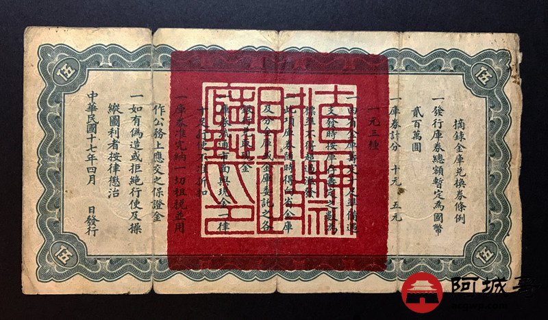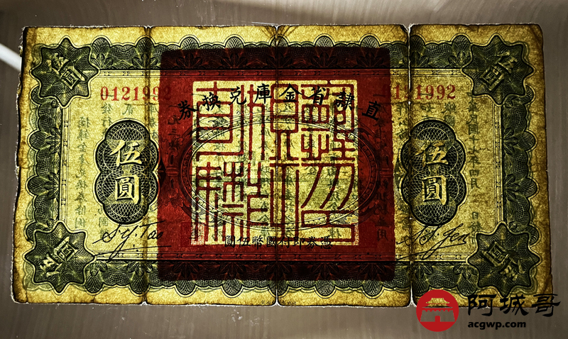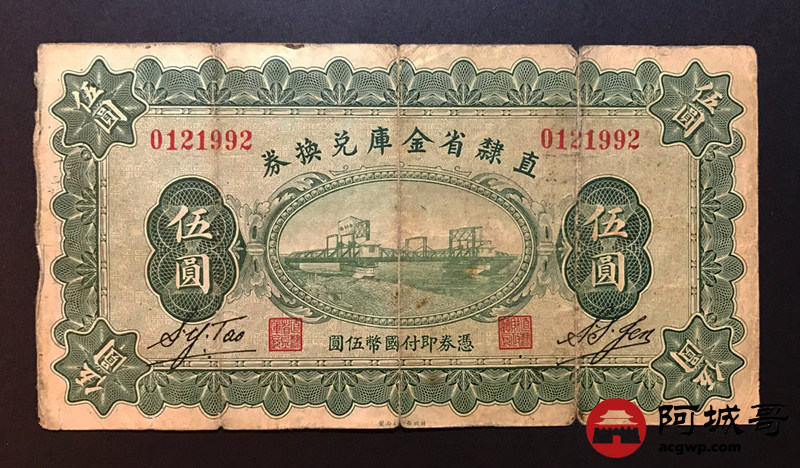 Lot:25 直隶省金库兑换券 民国17年 伍圆 原票 6成新 值得收藏