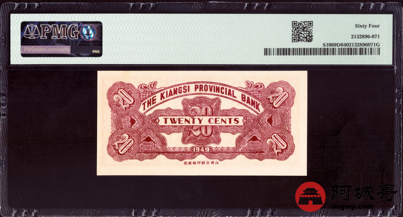 Lot:72 民国三十八年 江西省银行 辅币券 银元贰角 PMG 64 金马号